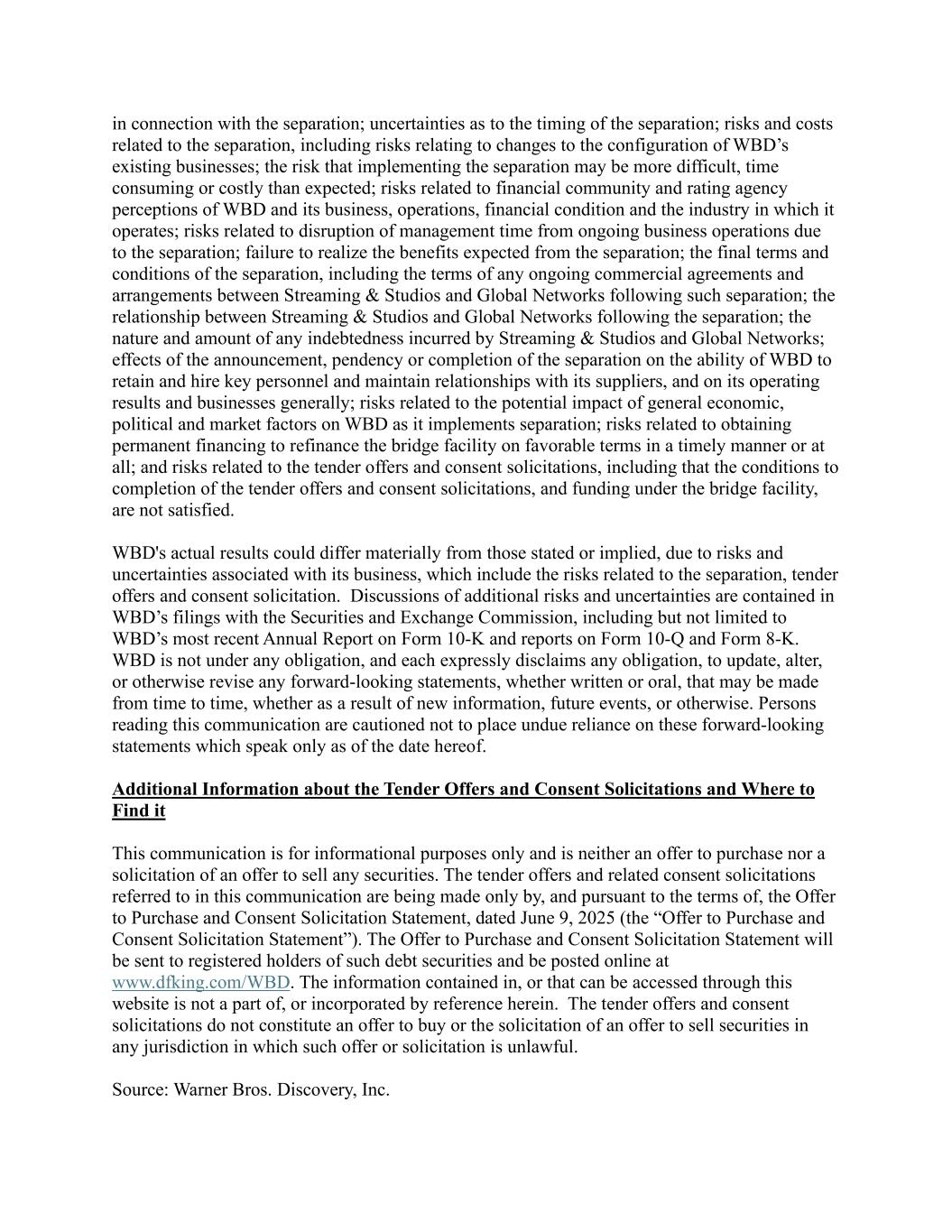 in connection with the separation; uncertainties as to the timing of the separation; risks and costs related to the separation, including risks relating to changes to the configuration of WBD’s existing businesses; the risk that implementing the separation may be more difficult, time consuming or costly than expected; risks related to financial community and rating agency perceptions of WBD and its business, operations, financial condition and the industry in which it operates; risks related to disruption of management time from ongoing business operations due to the separation; failure to realize the benefits expected from the separation; the final terms and conditions of the separation, including the terms of any ongoing commercial agreements and arrangements between Streaming & Studios and Global Networks following such separation; the relationship between Streaming & Studios and Global Networks following the separation; the nature and amount of any indebtedness incurred by Streaming & Studios and Global Networks; effects of the announcement, pendency or completion of the separation on the ability of WBD to retain and hire key personnel and maintain relationships with its suppliers, and on its operating results and businesses generally; risks related to the potential impact of general economic, political and market factors on WBD as it implements separation; risks related to obtaining permanent financing to refinance the bridge facility on favorable terms in a timely manner or at all; and risks related to the tender offers and consent solicitations, including that the conditions to completion of the tender offers and consent solicitations, and funding under the bridge facility, are not satisfied. WBD's actual results could differ materially from those stated or implied, due to risks and uncertainties associated with its business, which include the risks related to the separation, tender offers and consent solicitation. Discussions of additional risks and uncertainties are contained in WBD’s filings with the Securities and Exchange Commission, including but not limited to WBD’s most recent Annual Report on Form 10-K and reports on Form 10-Q and Form 8-K. WBD is not under any obligation, and each expressly disclaims any obligation, to update, alter, or otherwise revise any forward-looking statements, whether written or oral, that may be made from time to time, whether as a result of new information, future events, or otherwise. Persons reading this communication are cautioned not to place undue reliance on these forward-looking statements which speak only as of the date hereof. Additional Information about the Tender Offers and Consent Solicitations and Where to Find it This communication is for informational purposes only and is neither an offer to purchase nor a solicitation of an offer to sell any securities. The tender offers and related consent solicitations referred to in this communication are being made only by, and pursuant to the terms of, the Offer to Purchase and Consent Solicitation Statement, dated June 9, 2025 (the “Offer to Purchase and Consent Solicitation Statement”). The Offer to Purchase and Consent Solicitation Statement will be sent to registered holders of such debt securities and be posted online at www.dfking.com/WBD. The information contained in, or that can be accessed through this website is not a part of, or incorporated by reference herein. The tender offers and consent solicitations do not constitute an offer to buy or the solicitation of an offer to sell securities in any jurisdiction in which such offer or solicitation is unlawful. Source: Warner Bros. Discovery, Inc.