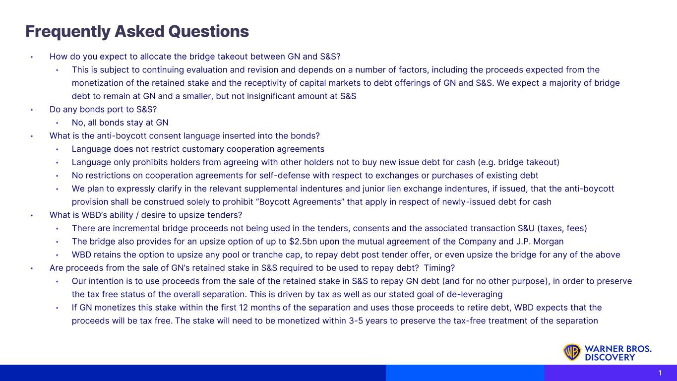 1 • How do you expect to allocate the bridge takeout between GN and S&S? • This is subject to continuing evaluation and revision and depends on a number of factors, including the proceeds expected from the monetization of the retained stake and the receptivity of capital markets to debt offerings of GN and S&S. We expect a majority of bridge debt to remain at GN and a smaller, but not insignificant amount at S&S • Do any bonds port to S&S? • No, all bonds stay at GN • What is the anti-boycott consent language inserted into the bonds? • Language does not restrict customary cooperation agreements • Language only prohibits holders from agreeing with other holders not to buy new issue debt for cash (e.g. bridge takeout) • No restrictions on cooperation agreements for self-defense with respect to exchanges or purchases of existing debt • We plan to expressly clarify in the relevant supplemental indentures and junior lien exchange indentures, if issued, that the anti-boycott provision shall be construed solely to prohibit “Boycott Agreements” that apply in respect of newly-issued debt for cash • What is WBD’s ability / desire to upsize tenders? • There are incremental bridge proceeds not being used in the tenders, consents and the associated transaction S&U (taxes, fees) • The bridge also provides for an upsize option of up to $2.5bn upon the mutual agreement of the Company and J.P. Morgan • WBD retains the option to upsize any pool or tranche cap, to repay debt post tender offer, or even upsize the bridge for any of the above • Are proceeds from the sale of GN’s retained stake in S&S required to be used to repay debt? Timing? • Our intention is to use proceeds from the sale of the retained stake in S&S to repay GN debt (and for no other purpose), in order to preserve the tax free status of the overall separation. This is driven by tax as well as our stated goal of de-leveraging • If GN monetizes this stake within the first 12 months of the separation and uses those proceeds to retire debt, WBD expects that the proceeds will be tax free. The stake will need to be monetized within 3-5 years to preserve the tax-free treatment of the separation Frequently Asked Questions