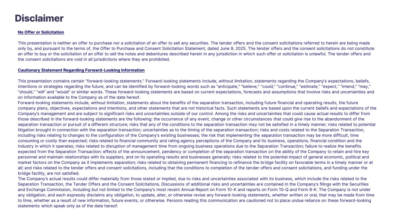 No Offer or Solicitation This presentation is neither an offer to purchase nor a solicitation of an offer to sell any securities. The tender offers and the consent solicitations referred to herein are being made only by, and pursuant to the terms of, the Offer to Purchase and Consent Solicitation Statement, dated June 9, 2025. The tender offers and the consent solicitations do not constitute an offer to buy or the solicitation of an offer to sell the notes and debentures described herein in any jurisdiction in which such offer or solicitation is unlawful. The tender offers and the consent solicitations are void in all jurisdictions where they are prohibited. Cautionary Statement Regarding Forward-Looking Information This presentation contains certain “forward-looking statements.” Forward-looking statements include, without limitation, statements regarding the Company’s expectations, beliefs, intentions or strategies regarding the future, and can be identified by forward-looking words such as “anticipate,” “believe,” “could,” “continue,” “estimate,” “expect,” “intend,” “may,” “should,” “will” and “would” or similar words. These forward-looking statements are based on current expectations, forecasts and assumptions that involve risks and uncertainties and on information available to the Company as of the date hereof. Forward-looking statements include, without limitation, statements about the benefits of the separation transaction, including future financial and operating results, the future company plans, objectives, expectations and intentions, and other statements that are not historical facts. Such statements are based upon the current beliefs and expectations of the Company’s management and are subject to significant risks and uncertainties outside of our control. Among the risks and uncertainties that could cause actual results to differ from those described in the forward-looking statements are the following: the occurrence of any event, change or other circumstances that could give rise to the abandonment of the separation transaction or pursuit of a different structure; risks that any of the conditions to the separation transaction may not be satisfied in a timely manner; risks related to potential litigation brought in connection with the separation transaction; uncertainties as to the timing of the separation transaction; risks and costs related to the Separation Transaction, including risks relating to changes to the configuration of the Company’s existing businesses; the risk that implementing the separation transaction may be more difficult, time consuming or costly than expected; risks related to financial community and rating agency perceptions of the Company and its business, operations, financial condition and the industry in which it operates; risks related to disruption of management time from ongoing business operations due to the Separation Transaction; failure to realize the benefits expected from the Separation Transaction; effects of the announcement, pendency or completion of the separation transaction on the ability of the Company to retain and hire key personnel and maintain relationships with its suppliers, and on its operating results and businesses generally; risks related to the potential impact of general economic, political and market factors on the Company as it implements separation; risks related to obtaining permanent financing to refinance the bridge facility on favorable terms in a timely manner or at all; and risks related to the tender offers and consent solicitations, including that the conditions to completion of the tender offers and consent solicitations, and funding under the bridge facility, are not satisfied. The Company’s actual results could differ materially from those stated or implied, due to risks and uncertainties associated with its business, which include the risks related to the Separation Transaction, the Tender Offers and the Consent Solicitations. Discussions of additional risks and uncertainties are contained in the Company’s filings with the Securities and Exchange Commission, including but not limited to the Company’s most recent Annual Report on Form 10-K and reports on Form 10-Q and Form 8-K. The Company is not under any obligation, and each expressly disclaims any obligation, to update, alter, or otherwise revise any forward-looking statements, whether written or oral, that may be made from time to time, whether as a result of new information, future events, or otherwise. Persons reading this communication are cautioned not to place undue reliance on these forward-looking statements which speak only as of the date hereof. Disclaimer