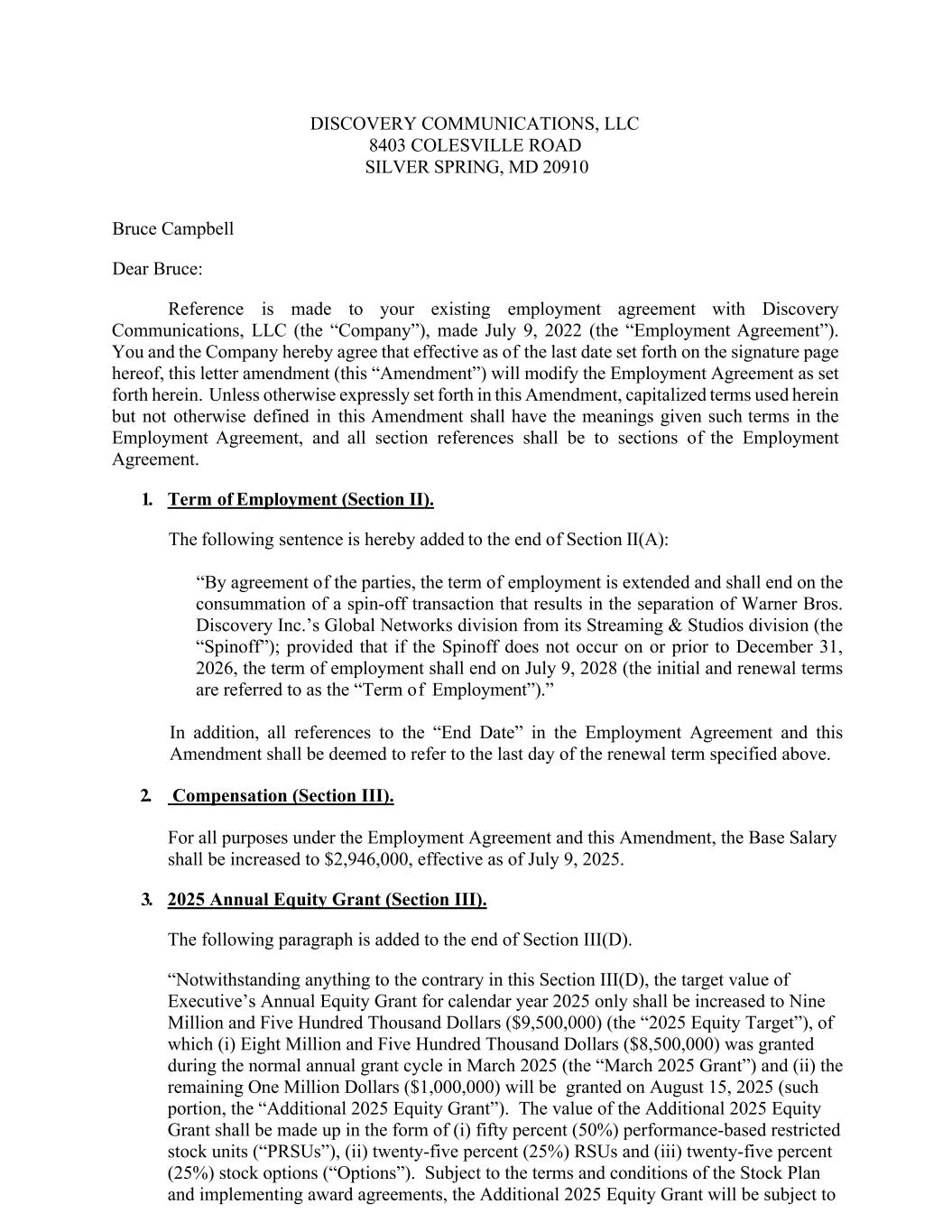 DISCOVERY COMMUNICATIONS, LLC 8403 COLESVILLE ROAD SILVER SPRING, MD 20910 Bruce Campbell Dear Bruce: Reference is made to your existing employment agreement with Discovery Communications, LLC (the “Company”), made July 9, 2022 (the “Employment Agreement”). You and the Company hereby agree that effective as of the last date set forth on the signature page hereof, this letter amendment (this “Amendment”) will modify the Employment Agreement as set forth herein. Unless otherwise expressly set forth in this Amendment, capitalized terms used herein but not otherwise defined in this Amendment shall have the meanings given such terms in the Employment Agreement, and all section references shall be to sections of the Employment Agreement. 1. Term of Employment (Section II). The following sentence is hereby added to the end of Section II(A): “By agreement of the parties, the term of employment is extended and shall end on the consummation of a spin-off transaction that results in the separation of Warner Bros. Discovery Inc.’s Global Networks division from its Streaming & Studios division (the “Spinoff”); provided that if the Spinoff does not occur on or prior to December 31, 2026, the term of employment shall end on July 9, 2028 (the initial and renewal terms are referred to as the “Term of Employment”).” In addition, all references to the “End Date” in the Employment Agreement and this Amendment shall be deemed to refer to the last day of the renewal term specified above. 2. Compensation (Section III). For all purposes under the Employment Agreement and this Amendment, the Base Salary shall be increased to $2,946,000, effective as of July 9, 2025. 3. 2025 Annual Equity Grant (Section III). The following paragraph is added to the end of Section III(D). “Notwithstanding anything to the contrary in this Section III(D), the target value of Executive’s Annual Equity Grant for calendar year 2025 only shall be increased to Nine Million and Five Hundred Thousand Dollars ($9,500,000) (the “2025 Equity Target”), of which (i) Eight Million and Five Hundred Thousand Dollars ($8,500,000) was granted during the normal annual grant cycle in March 2025 (the “March 2025 Grant”) and (ii) the remaining One Million Dollars ($1,000,000) will be granted on August 15, 2025 (such portion, the “Additional 2025 Equity Grant”). The value of the Additional 2025 Equity Grant shall be made up in the form of (i) fifty percent (50%) performance-based restricted stock units (“PRSUs”), (ii) twenty-five percent (25%) RSUs and (iii) twenty-five percent (25%) stock options (“Options”). Subject to the terms and conditions of the Stock Plan and implementing award agreements, the Additional 2025 Equity Grant will be subject to