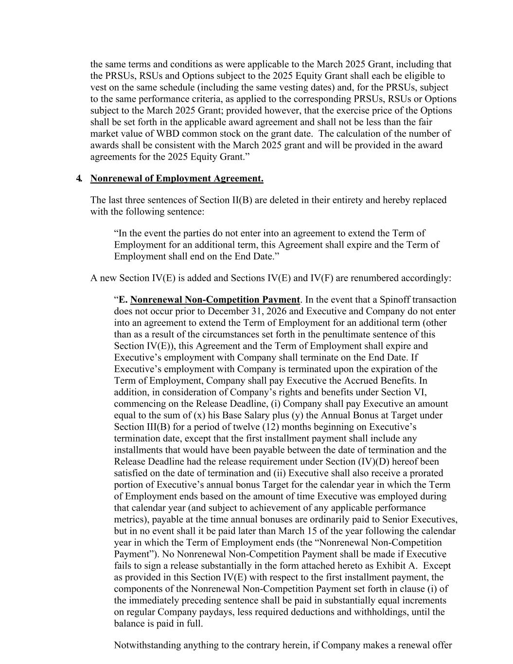 the same terms and conditions as were applicable to the March 2025 Grant, including that the PRSUs, RSUs and Options subject to the 2025 Equity Grant shall each be eligible to vest on the same schedule (including the same vesting dates) and, for the PRSUs, subject to the same performance criteria, as applied to the corresponding PRSUs, RSUs or Options subject to the March 2025 Grant; provided however, that the exercise price of the Options shall be set forth in the applicable award agreement and shall not be less than the fair market value of WBD common stock on the grant date. The calculation of the number of awards shall be consistent with the March 2025 grant and will be provided in the award agreements for the 2025 Equity Grant.” 4. Nonrenewal of Employment Agreement. The last three sentences of Section II(B) are deleted in their entirety and hereby replaced with the following sentence: “In the event the parties do not enter into an agreement to extend the Term of Employment for an additional term, this Agreement shall expire and the Term of Employment shall end on the End Date.” A new Section IV(E) is added and Sections IV(E) and IV(F) are renumbered accordingly: “E. Nonrenewal Non-Competition Payment. In the event that a Spinoff transaction does not occur prior to December 31, 2026 and Executive and Company do not enter into an agreement to extend the Term of Employment for an additional term (other than as a result of the circumstances set forth in the penultimate sentence of this Section IV(E)), this Agreement and the Term of Employment shall expire and Executive’s employment with Company shall terminate on the End Date. If Executive’s employment with Company is terminated upon the expiration of the Term of Employment, Company shall pay Executive the Accrued Benefits. In addition, in consideration of Company’s rights and benefits under Section VI, commencing on the Release Deadline, (i) Company shall pay Executive an amount equal to the sum of (x) his Base Salary plus (y) the Annual Bonus at Target under Section III(B) for a period of twelve (12) months beginning on Executive’s termination date, except that the first installment payment shall include any installments that would have been payable between the date of termination and the Release Deadline had the release requirement under Section (IV)(D) hereof been satisfied on the date of termination and (ii) Executive shall also receive a prorated portion of Executive’s annual bonus Target for the calendar year in which the Term of Employment ends based on the amount of time Executive was employed during that calendar year (and subject to achievement of any applicable performance metrics), payable at the time annual bonuses are ordinarily paid to Senior Executives, but in no event shall it be paid later than March 15 of the year following the calendar year in which the Term of Employment ends (the “Nonrenewal Non-Competition Payment”). No Nonrenewal Non-Competition Payment shall be made if Executive fails to sign a release substantially in the form attached hereto as Exhibit A. Except as provided in this Section IV(E) with respect to the first installment payment, the components of the Nonrenewal Non-Competition Payment set forth in clause (i) of the immediately preceding sentence shall be paid in substantially equal increments on regular Company paydays, less required deductions and withholdings, until the balance is paid in full. Notwithstanding anything to the contrary herein, if Company makes a renewal offer