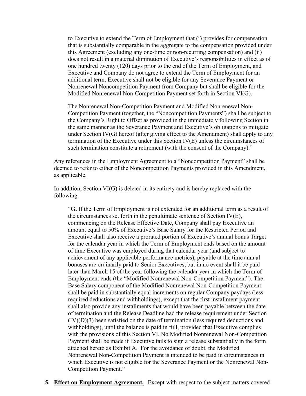 to Executive to extend the Term of Employment that (i) provides for compensation that is substantially comparable in the aggregate to the compensation provided under this Agreement (excluding any one-time or non-recurring compensation) and (ii) does not result in a material diminution of Executive’s responsibilities in effect as of one hundred twenty (120) days prior to the end of the Term of Employment, and Executive and Company do not agree to extend the Term of Employment for an additional term, Executive shall not be eligible for any Severance Payment or Nonrenewal Noncompetition Payment from Company but shall be eligible for the Modified Nonrenewal Non-Competition Payment set forth in Section VI(G). The Nonrenewal Non-Competition Payment and Modified Nonrenewal Non- Competition Payment (together, the “Noncompetition Payments”) shall be subject to the Company’s Right to Offset as provided in the immediately following Section in the same manner as the Severance Payment and Executive’s obligations to mitigate under Section IV(G) hereof (after giving effect to the Amendment) shall apply to any termination of the Executive under this Section IV(E) unless the circumstances of such termination constitute a retirement (with the consent of the Company).” Any references in the Employment Agreement to a “Noncompetition Payment” shall be deemed to refer to either of the Noncompetition Payments provided in this Amendment, as applicable. In addition, Section VI(G) is deleted in its entirety and is hereby replaced with the following: “G. If the Term of Employment is not extended for an additional term as a result of the circumstances set forth in the penultimate sentence of Section IV(E), commencing on the Release Effective Date, Company shall pay Executive an amount equal to 50% of Executive’s Base Salary for the Restricted Period and Executive shall also receive a prorated portion of Executive’s annual bonus Target for the calendar year in which the Term of Employment ends based on the amount of time Executive was employed during that calendar year (and subject to achievement of any applicable performance metrics), payable at the time annual bonuses are ordinarily paid to Senior Executives, but in no event shall it be paid later than March 15 of the year following the calendar year in which the Term of Employment ends (the “Modified Nonrenewal Non-Competition Payment”). The Base Salary component of the Modified Nonrenewal Non-Competition Payment shall be paid in substantially equal increments on regular Company paydays (less required deductions and withholdings), except that the first installment payment shall also provide any installments that would have been payable between the date of termination and the Release Deadline had the release requirement under Section (IV)(D)(3) been satisfied on the date of termination (less required deductions and withholdings), until the balance is paid in full, provided that Executive complies with the provisions of this Section VI. No Modified Nonrenewal Non-Competition Payment shall be made if Executive fails to sign a release substantially in the form attached hereto as Exhibit A. For the avoidance of doubt, the Modified Nonrenewal Non-Competition Payment is intended to be paid in circumstances in which Executive is not eligible for the Severance Payment or the Nonrenewal Non- Competition Payment.” 5. Effect on Employment Agreement. Except with respect to the subject matters covered