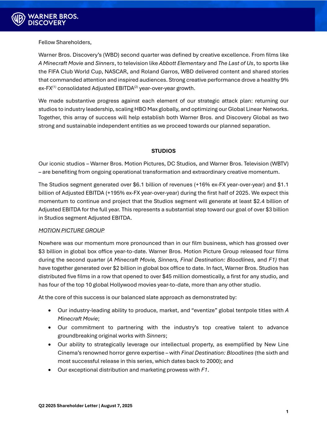 Q2 2025 Shareholder Letter | August 7, 2025 1 Fellow Shareholders, Warner Bros. Discovery’s (WBD) second quarter was defined by creative excellence. From films like A Minecraft Movie and Sinners, to television like Abbott Elementary and The Last of Us, to sports like the FIFA Club World Cup, NASCAR, and Roland Garros, WBD delivered content and shared stories that commanded attention and inspired audiences. Strong creative performance drove a healthy 9% ex-FX(1) consolidated Adjusted EBITDA(2) year-over-year growth. We made substantive progress against each element of our strategic attack plan: returning our studios to industry leadership, scaling HBO Max globally, and optimizing our Global Linear Networks. Together, this array of success will help establish both Warner Bros. and Discovery Global as two strong and sustainable independent entities as we proceed towards our planned separation. STUDIOS Our iconic studios – Warner Bros. Motion Pictures, DC Studios, and Warner Bros. Television (WBTV) – are benefiting from ongoing operational transformation and extraordinary creative momentum. The Studios segment generated over $6.1 billion of revenues (+16% ex-FX year-over-year) and $1.1 billion of Adjusted EBITDA (+195% ex-FX year-over-year) during the first half of 2025. We expect this momentum to continue and project that the Studios segment will generate at least $2.4 billion of Adjusted EBITDA for the full year. This represents a substantial step toward our goal of over $3 billion in Studios segment Adjusted EBITDA. MOTION PICTURE GROUP Nowhere was our momentum more pronounced than in our film business, which has grossed over $3 billion in global box office year-to-date. Warner Bros. Motion Picture Group released four films during the second quarter (A Minecraft Movie, Sinners, Final Destination: Bloodlines, and F1) that have together generated over $2 billion in global box office to date. In fact, Warner Bros. Studios has distributed five films in a row that opened to over $45 million domestically, a first for any studio, and has four of the top 10 global Hollywood movies year-to-date, more than any other studio. At the core of this success is our balanced slate approach as demonstrated by: • Our industry-leading ability to produce, market, and “eventize” global tentpole titles with A Minecraft Movie; • Our commitment to partnering with the industry’s top creative talent to advance groundbreaking original works with Sinners; • Our ability to strategically leverage our intellectual property, as exemplified by New Line Cinema’s renowned horror genre expertise – with Final Destination: Bloodlines (the sixth and most successful release in this series, which dates back to 2000); and • Our exceptional distribution and marketing prowess with F1.