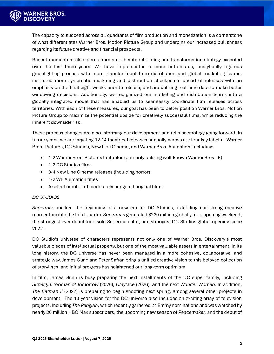 Q2 2025 Shareholder Letter | August 7, 2025 2 The capacity to succeed across all quadrants of film production and monetization is a cornerstone of what differentiates Warner Bros. Motion Picture Group and underpins our increased bullishness regarding its future creative and financial prospects. Recent momentum also stems from a deliberate rebuilding and transformation strategy executed over the last three years. We have implemented a more bottoms-up, analytically rigorous greenlighting process with more granular input from distribution and global marketing teams, instituted more systematic marketing and distribution checkpoints ahead of releases with an emphasis on the final eight weeks prior to release, and are utilizing real-time data to make better windowing decisions. Additionally, we reorganized our marketing and distribution teams into a globally integrated model that has enabled us to seamlessly coordinate film releases across territories. With each of these measures, our goal has been to better position Warner Bros. Motion Picture Group to maximize the potential upside for creatively successful films, while reducing the inherent downside risk. These process changes are also informing our development and release strategy going forward. In future years, we are targeting 12-14 theatrical releases annually across our four key labels – Warner Bros. Pictures, DC Studios, New Line Cinema, and Warner Bros. Animation, including: • 1-2 Warner Bros. Pictures tentpoles (primarily utilizing well-known Warner Bros. IP) • 1-2 DC Studios films • 3-4 New Line Cinema releases (including horror) • 1-2 WB Animation titles • A select number of moderately budgeted original films. DC STUDIOS Superman marked the beginning of a new era for DC Studios, extending our strong creative momentum into the third quarter. Superman generated $220 million globally in its opening weekend, the strongest ever debut for a solo Superman film, and strongest DC Studios global opening since 2022. DC Studio’s universe of characters represents not only one of Warner Bros. Discovery’s most valuable pieces of intellectual property, but one of the most valuable assets in entertainment. In its long history, the DC universe has never been managed in a more cohesive, collaborative, and strategic way. James Gunn and Peter Safran bring a unified creative vision to this beloved collection of storylines, and initial progress has heightened our long-term optimism. In film, James Gunn is busy preparing the next installments of the DC super family, including Supergirl: Woman of Tomorrow (2026), Clayface (2026), and the next Wonder Woman. In addition, The Batman II (2027) is preparing to begin shooting next spring, among several other projects in development. The 10-year vision for the DC universe also includes an exciting array of television projects, including The Penguin, which recently garnered 24 Emmy nominations and was watched by nearly 20 million HBO Max subscribers, the upcoming new season of Peacemaker, and the debut of