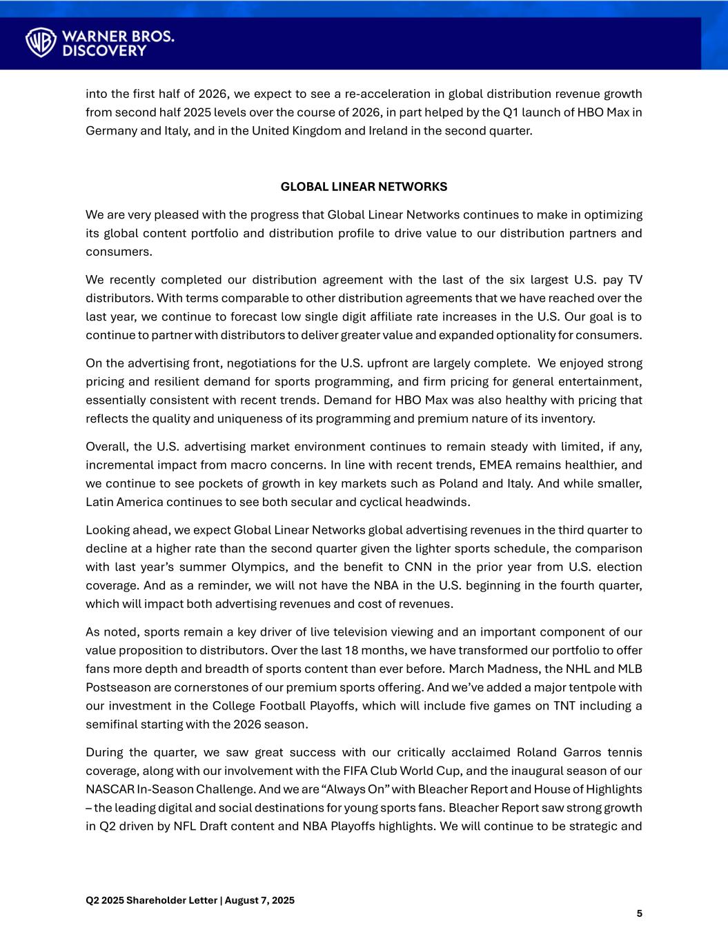 Q2 2025 Shareholder Letter | August 7, 2025 5 into the first half of 2026, we expect to see a re-acceleration in global distribution revenue growth from second half 2025 levels over the course of 2026, in part helped by the Q1 launch of HBO Max in Germany and Italy, and in the United Kingdom and Ireland in the second quarter. GLOBAL LINEAR NETWORKS We are very pleased with the progress that Global Linear Networks continues to make in optimizing its global content portfolio and distribution profile to drive value to our distribution partners and consumers. We recently completed our distribution agreement with the last of the six largest U.S. pay TV distributors. With terms comparable to other distribution agreements that we have reached over the last year, we continue to forecast low single digit affiliate rate increases in the U.S. Our goal is to continue to partner with distributors to deliver greater value and expanded optionality for consumers. On the advertising front, negotiations for the U.S. upfront are largely complete. We enjoyed strong pricing and resilient demand for sports programming, and firm pricing for general entertainment, essentially consistent with recent trends. Demand for HBO Max was also healthy with pricing that reflects the quality and uniqueness of its programming and premium nature of its inventory. Overall, the U.S. advertising market environment continues to remain steady with limited, if any, incremental impact from macro concerns. In line with recent trends, EMEA remains healthier, and we continue to see pockets of growth in key markets such as Poland and Italy. And while smaller, Latin America continues to see both secular and cyclical headwinds. Looking ahead, we expect Global Linear Networks global advertising revenues in the third quarter to decline at a higher rate than the second quarter given the lighter sports schedule, the comparison with last year’s summer Olympics, and the benefit to CNN in the prior year from U.S. election coverage. And as a reminder, we will not have the NBA in the U.S. beginning in the fourth quarter, which will impact both advertising revenues and cost of revenues. As noted, sports remain a key driver of live television viewing and an important component of our value proposition to distributors. Over the last 18 months, we have transformed our portfolio to offer fans more depth and breadth of sports content than ever before. March Madness, the NHL and MLB Postseason are cornerstones of our premium sports offering. And we’ve added a major tentpole with our investment in the College Football Playoffs, which will include five games on TNT including a semifinal starting with the 2026 season. During the quarter, we saw great success with our critically acclaimed Roland Garros tennis coverage, along with our involvement with the FIFA Club World Cup, and the inaugural season of our NASCAR In-Season Challenge. And we are “Always On” with Bleacher Report and House of Highlights – the leading digital and social destinations for young sports fans. Bleacher Report saw strong growth in Q2 driven by NFL Draft content and NBA Playoffs highlights. We will continue to be strategic and