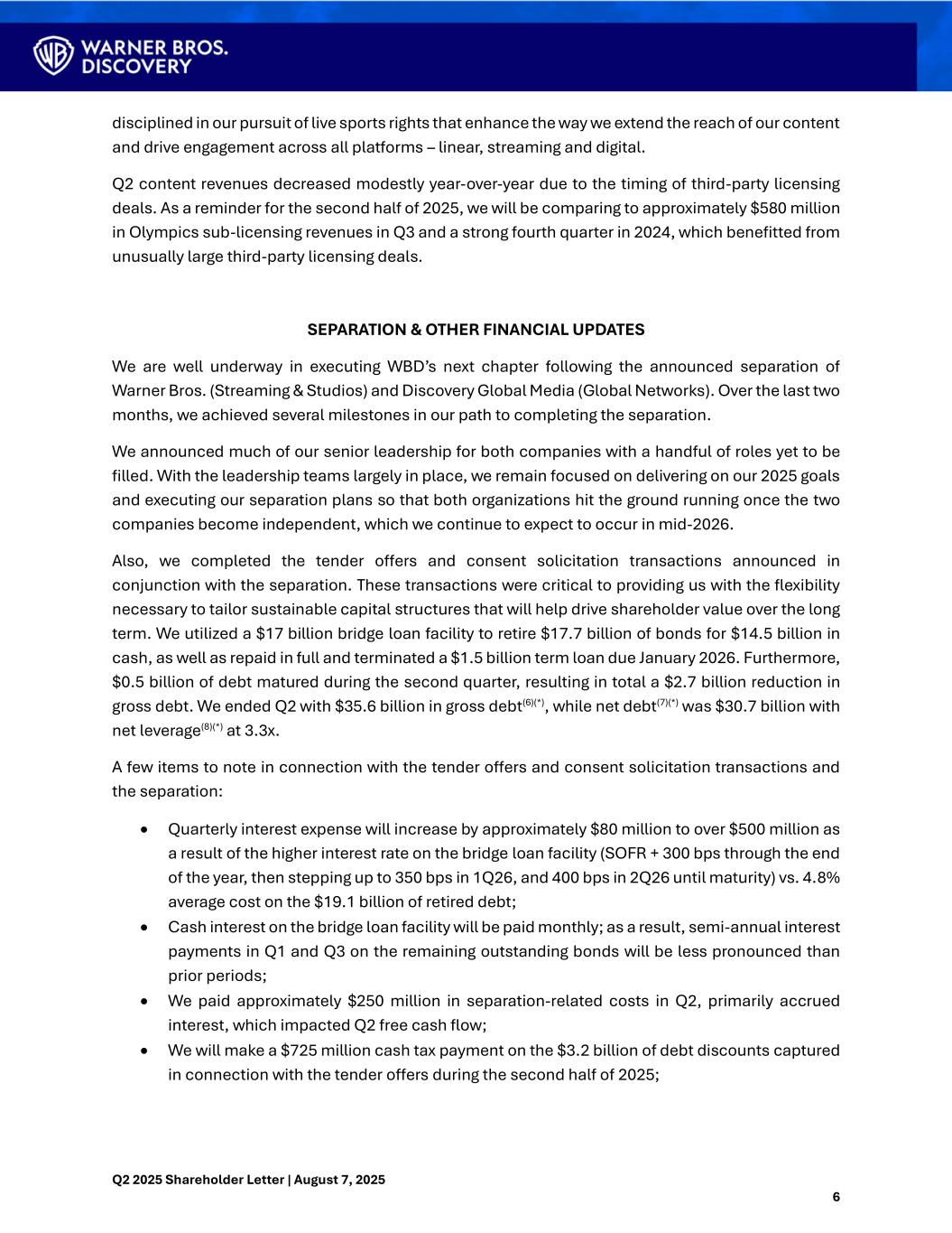 Q2 2025 Shareholder Letter | August 7, 2025 6 disciplined in our pursuit of live sports rights that enhance the way we extend the reach of our content and drive engagement across all platforms – linear, streaming and digital. Q2 content revenues decreased modestly year-over-year due to the timing of third-party licensing deals. As a reminder for the second half of 2025, we will be comparing to approximately $580 million in Olympics sub-licensing revenues in Q3 and a strong fourth quarter in 2024, which benefitted from unusually large third-party licensing deals. SEPARATION & OTHER FINANCIAL UPDATES We are well underway in executing WBD’s next chapter following the announced separation of Warner Bros. (Streaming & Studios) and Discovery Global Media (Global Networks). Over the last two months, we achieved several milestones in our path to completing the separation. We announced much of our senior leadership for both companies with a handful of roles yet to be filled. With the leadership teams largely in place, we remain focused on delivering on our 2025 goals and executing our separation plans so that both organizations hit the ground running once the two companies become independent, which we continue to expect to occur in mid-2026. Also, we completed the tender offers and consent solicitation transactions announced in conjunction with the separation. These transactions were critical to providing us with the flexibility necessary to tailor sustainable capital structures that will help drive shareholder value over the long term. We utilized a $17 billion bridge loan facility to retire $17.7 billion of bonds for $14.5 billion in cash, as well as repaid in full and terminated a $1.5 billion term loan due January 2026. Furthermore, $0.5 billion of debt matured during the second quarter, resulting in total a $2.7 billion reduction in gross debt. We ended Q2 with $35.6 billion in gross debt(6)(*), while net debt(7)(*) was $30.7 billion with net leverage(8)(*) at 3.3x. A few items to note in connection with the tender offers and consent solicitation transactions and the separation: • Quarterly interest expense will increase by approximately $80 million to over $500 million as a result of the higher interest rate on the bridge loan facility (SOFR + 300 bps through the end of the year, then stepping up to 350 bps in 1Q26, and 400 bps in 2Q26 until maturity) vs. 4.8% average cost on the $19.1 billion of retired debt; • Cash interest on the bridge loan facility will be paid monthly; as a result, semi-annual interest payments in Q1 and Q3 on the remaining outstanding bonds will be less pronounced than prior periods; • We paid approximately $250 million in separation-related costs in Q2, primarily accrued interest, which impacted Q2 free cash flow; • We will make a $725 million cash tax payment on the $3.2 billion of debt discounts captured in connection with the tender offers during the second half of 2025;