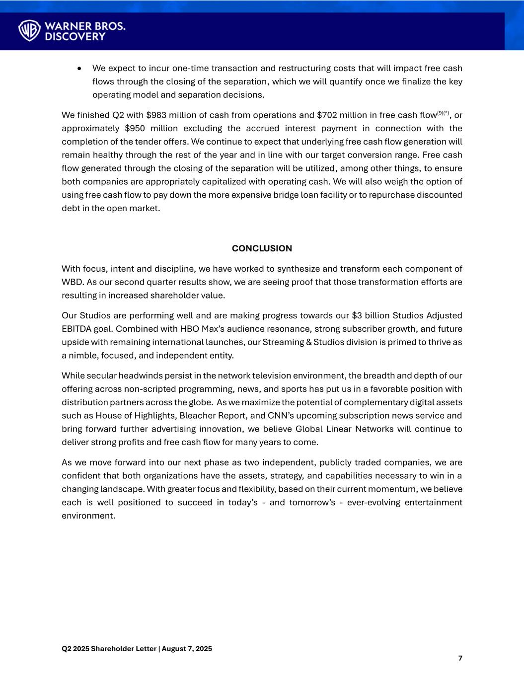 Q2 2025 Shareholder Letter | August 7, 2025 7 • We expect to incur one-time transaction and restructuring costs that will impact free cash flows through the closing of the separation, which we will quantify once we finalize the key operating model and separation decisions. We finished Q2 with $983 million of cash from operations and $702 million in free cash flow(9)(*), or approximately $950 million excluding the accrued interest payment in connection with the completion of the tender offers. We continue to expect that underlying free cash flow generation will remain healthy through the rest of the year and in line with our target conversion range. Free cash flow generated through the closing of the separation will be utilized, among other things, to ensure both companies are appropriately capitalized with operating cash. We will also weigh the option of using free cash flow to pay down the more expensive bridge loan facility or to repurchase discounted debt in the open market. CONCLUSION With focus, intent and discipline, we have worked to synthesize and transform each component of WBD. As our second quarter results show, we are seeing proof that those transformation efforts are resulting in increased shareholder value. Our Studios are performing well and are making progress towards our $3 billion Studios Adjusted EBITDA goal. Combined with HBO Max’s audience resonance, strong subscriber growth, and future upside with remaining international launches, our Streaming & Studios division is primed to thrive as a nimble, focused, and independent entity. While secular headwinds persist in the network television environment, the breadth and depth of our offering across non-scripted programming, news, and sports has put us in a favorable position with distribution partners across the globe. As we maximize the potential of complementary digital assets such as House of Highlights, Bleacher Report, and CNN’s upcoming subscription news service and bring forward further advertising innovation, we believe Global Linear Networks will continue to deliver strong profits and free cash flow for many years to come. As we move forward into our next phase as two independent, publicly traded companies, we are confident that both organizations have the assets, strategy, and capabilities necessary to win in a changing landscape. With greater focus and flexibility, based on their current momentum, we believe each is well positioned to succeed in today’s - and tomorrow’s - ever-evolving entertainment environment.