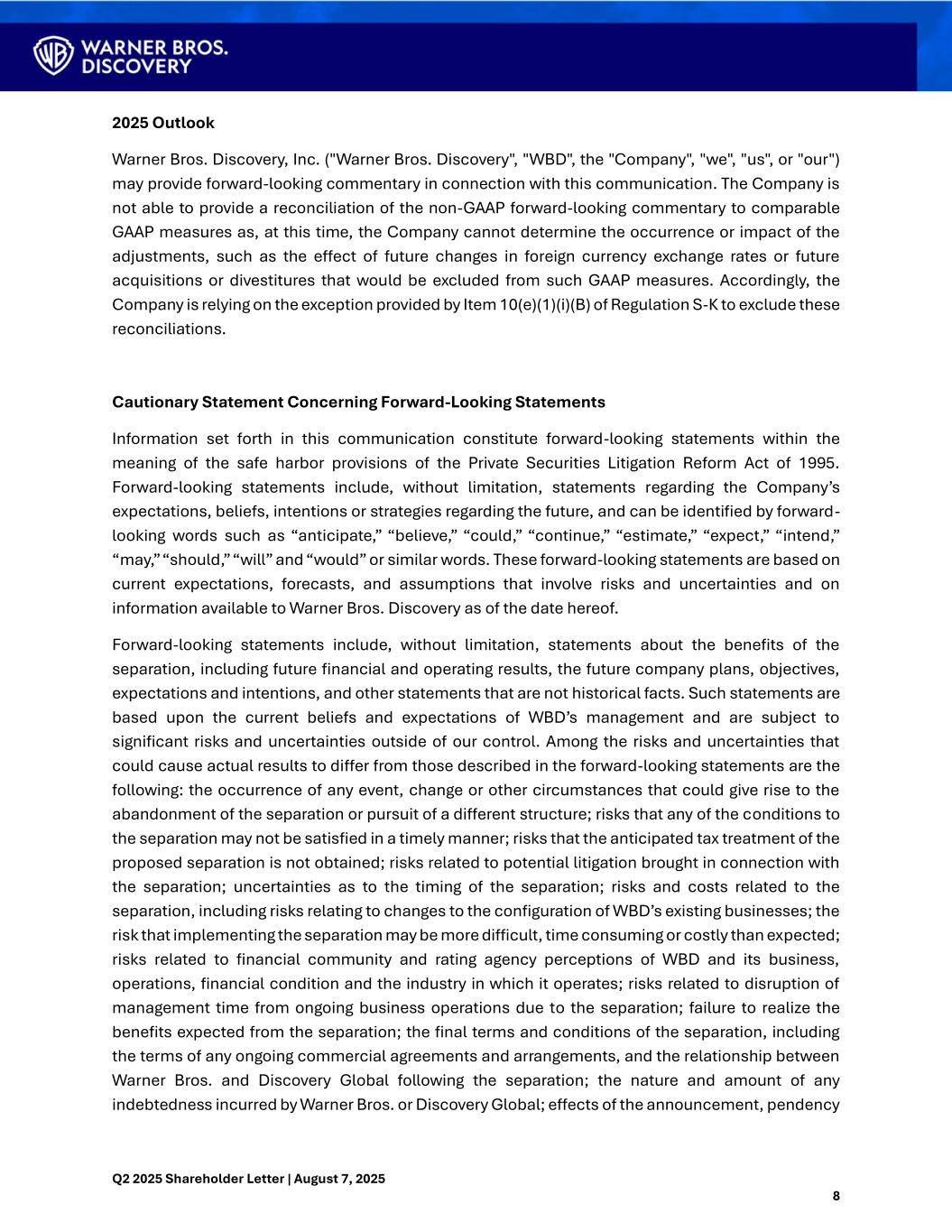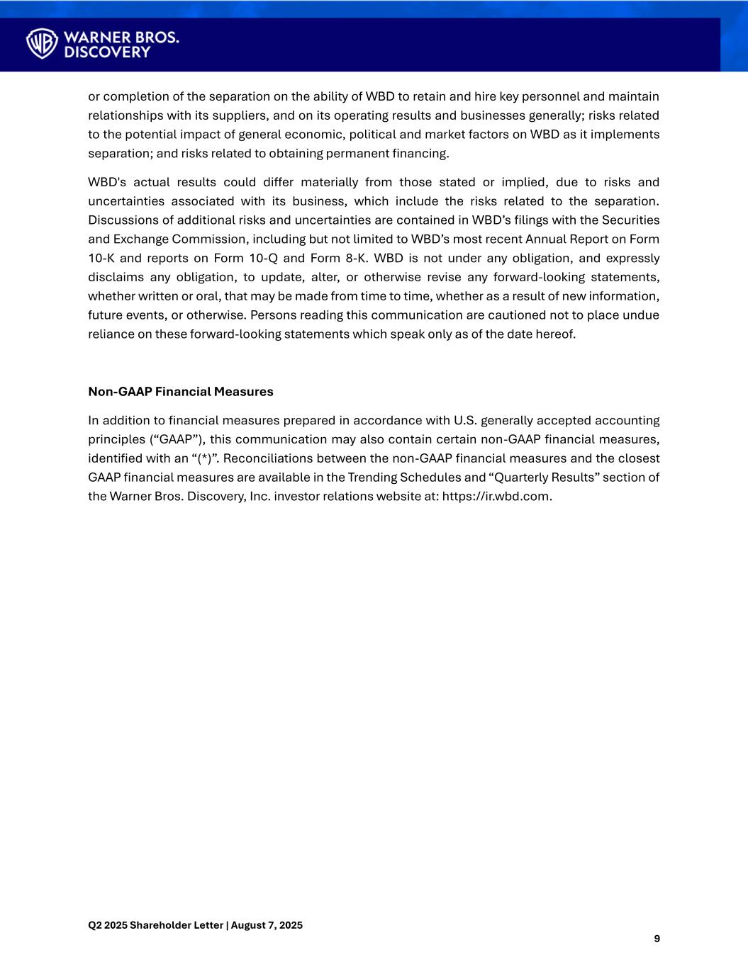 Q2 2025 Shareholder Letter | August 7, 2025 9 or completion of the separation on the ability of WBD to retain and hire key personnel and maintain relationships with its suppliers, and on its operating results and businesses generally; risks related to the potential impact of general economic, political and market factors on WBD as it implements separation; and risks related to obtaining permanent financing. WBD's actual results could differ materially from those stated or implied, due to risks and uncertainties associated with its business, which include the risks related to the separation. Discussions of additional risks and uncertainties are contained in WBD’s filings with the Securities and Exchange Commission, including but not limited to WBD’s most recent Annual Report on Form 10-K and reports on Form 10-Q and Form 8-K. WBD is not under any obligation, and expressly disclaims any obligation, to update, alter, or otherwise revise any forward-looking statements, whether written or oral, that may be made from time to time, whether as a result of new information, future events, or otherwise. Persons reading this communication are cautioned not to place undue reliance on these forward-looking statements which speak only as of the date hereof. Non-GAAP Financial Measures In addition to financial measures prepared in accordance with U.S. generally accepted accounting principles (“GAAP”), this communication may also contain certain non-GAAP financial measures, identified with an “(*)”. Reconciliations between the non-GAAP financial measures and the closest GAAP financial measures are available in the Trending Schedules and “Quarterly Results” section of the Warner Bros. Discovery, Inc. investor relations website at: https://ir.wbd.com.