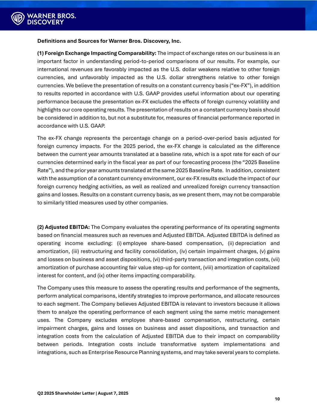 Q2 2025 Shareholder Letter | August 7, 2025 10 Definitions and Sources for Warner Bros. Discovery, Inc. (1) Foreign Exchange Impacting Comparability: The impact of exchange rates on our business is an important factor in understanding period-to-period comparisons of our results. For example, our international revenues are favorably impacted as the U.S. dollar weakens relative to other foreign currencies, and unfavorably impacted as the U.S. dollar strengthens relative to other foreign currencies. We believe the presentation of results on a constant currency basis (“ex-FX”), in addition to results reported in accordance with U.S. GAAP provides useful information about our operating performance because the presentation ex-FX excludes the effects of foreign currency volatility and highlights our core operating results. The presentation of results on a constant currency basis should be considered in addition to, but not a substitute for, measures of financial performance reported in accordance with U.S. GAAP. The ex-FX change represents the percentage change on a period-over-period basis adjusted for foreign currency impacts. For the 2025 period, the ex-FX change is calculated as the difference between the current year amounts translated at a baseline rate, which is a spot rate for each of our currencies determined early in the fiscal year as part of our forecasting process (the “2025 Baseline Rate”), and the prior year amounts translated at the same 2025 Baseline Rate. In addition, consistent with the assumption of a constant currency environment, our ex-FX results exclude the impact of our foreign currency hedging activities, as well as realized and unrealized foreign currency transaction gains and losses. Results on a constant currency basis, as we present them, may not be comparable to similarly titled measures used by other companies. (2) Adjusted EBITDA: The Company evaluates the operating performance of its operating segments based on financial measures such as revenues and Adjusted EBITDA. Adjusted EBITDA is defined as operating income excluding: (i) employee share-based compensation, (ii) depreciation and amortization, (iii) restructuring and facility consolidation, (iv) certain impairment charges, (v) gains and losses on business and asset dispositions, (vi) third-party transaction and integration costs, (vii) amortization of purchase accounting fair value step-up for content, (viii) amortization of capitalized interest for content, and (ix) other items impacting comparability. The Company uses this measure to assess the operating results and performance of the segments, perform analytical comparisons, identify strategies to improve performance, and allocate resources to each segment. The Company believes Adjusted EBITDA is relevant to investors because it allows them to analyze the operating performance of each segment using the same metric management uses. The Company excludes employee share-based compensation, restructuring, certain impairment charges, gains and losses on business and asset dispositions, and transaction and integration costs from the calculation of Adjusted EBITDA due to their impact on comparability between periods. Integration costs include transformative system implementations and integrations, such as Enterprise Resource Planning systems, and may take several years to complete.