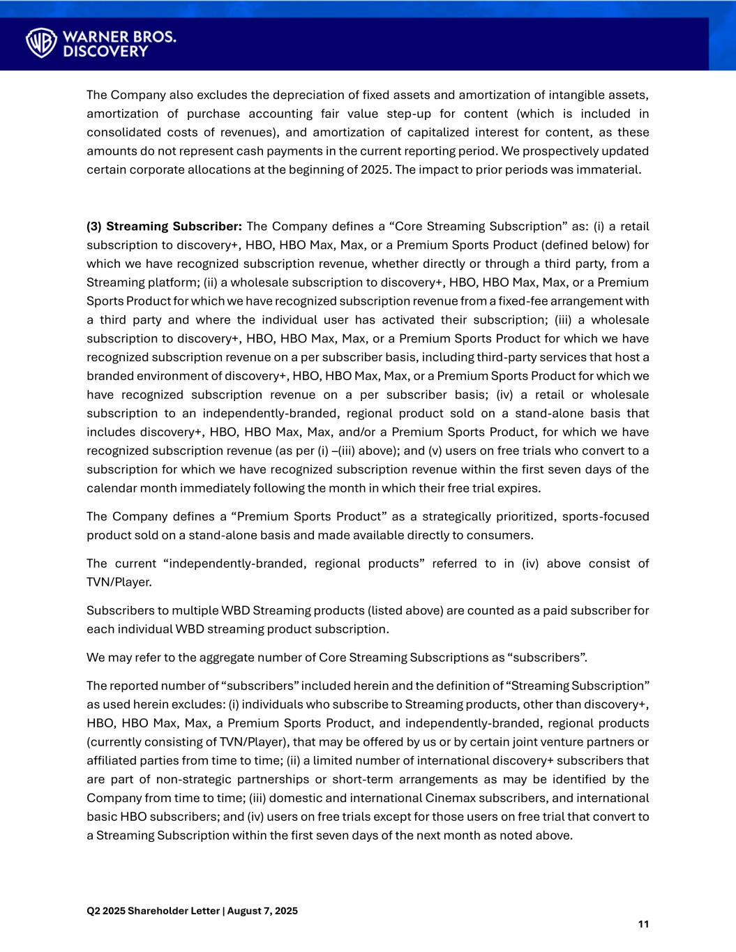 Q2 2025 Shareholder Letter | August 7, 2025 11 The Company also excludes the depreciation of fixed assets and amortization of intangible assets, amortization of purchase accounting fair value step-up for content (which is included in consolidated costs of revenues), and amortization of capitalized interest for content, as these amounts do not represent cash payments in the current reporting period. We prospectively updated certain corporate allocations at the beginning of 2025. The impact to prior periods was immaterial. (3) Streaming Subscriber: The Company defines a “Core Streaming Subscription” as: (i) a retail subscription to discovery+, HBO, HBO Max, Max, or a Premium Sports Product (defined below) for which we have recognized subscription revenue, whether directly or through a third party, from a Streaming platform; (ii) a wholesale subscription to discovery+, HBO, HBO Max, Max, or a Premium Sports Product for which we have recognized subscription revenue from a fixed-fee arrangement with a third party and where the individual user has activated their subscription; (iii) a wholesale subscription to discovery+, HBO, HBO Max, Max, or a Premium Sports Product for which we have recognized subscription revenue on a per subscriber basis, including third-party services that host a branded environment of discovery+, HBO, HBO Max, Max, or a Premium Sports Product for which we have recognized subscription revenue on a per subscriber basis; (iv) a retail or wholesale subscription to an independently-branded, regional product sold on a stand-alone basis that includes discovery+, HBO, HBO Max, Max, and/or a Premium Sports Product, for which we have recognized subscription revenue (as per (i) –(iii) above); and (v) users on free trials who convert to a subscription for which we have recognized subscription revenue within the first seven days of the calendar month immediately following the month in which their free trial expires. The Company defines a “Premium Sports Product” as a strategically prioritized, sports-focused product sold on a stand-alone basis and made available directly to consumers. The current “independently-branded, regional products” referred to in (iv) above consist of TVN/Player. Subscribers to multiple WBD Streaming products (listed above) are counted as a paid subscriber for each individual WBD streaming product subscription. We may refer to the aggregate number of Core Streaming Subscriptions as “subscribers”. The reported number of “subscribers” included herein and the definition of “Streaming Subscription” as used herein excludes: (i) individuals who subscribe to Streaming products, other than discovery+, HBO, HBO Max, Max, a Premium Sports Product, and independently-branded, regional products (currently consisting of TVN/Player), that may be offered by us or by certain joint venture partners or affiliated parties from time to time; (ii) a limited number of international discovery+ subscribers that are part of non-strategic partnerships or short-term arrangements as may be identified by the Company from time to time; (iii) domestic and international Cinemax subscribers, and international basic HBO subscribers; and (iv) users on free trials except for those users on free trial that convert to a Streaming Subscription within the first seven days of the next month as noted above.