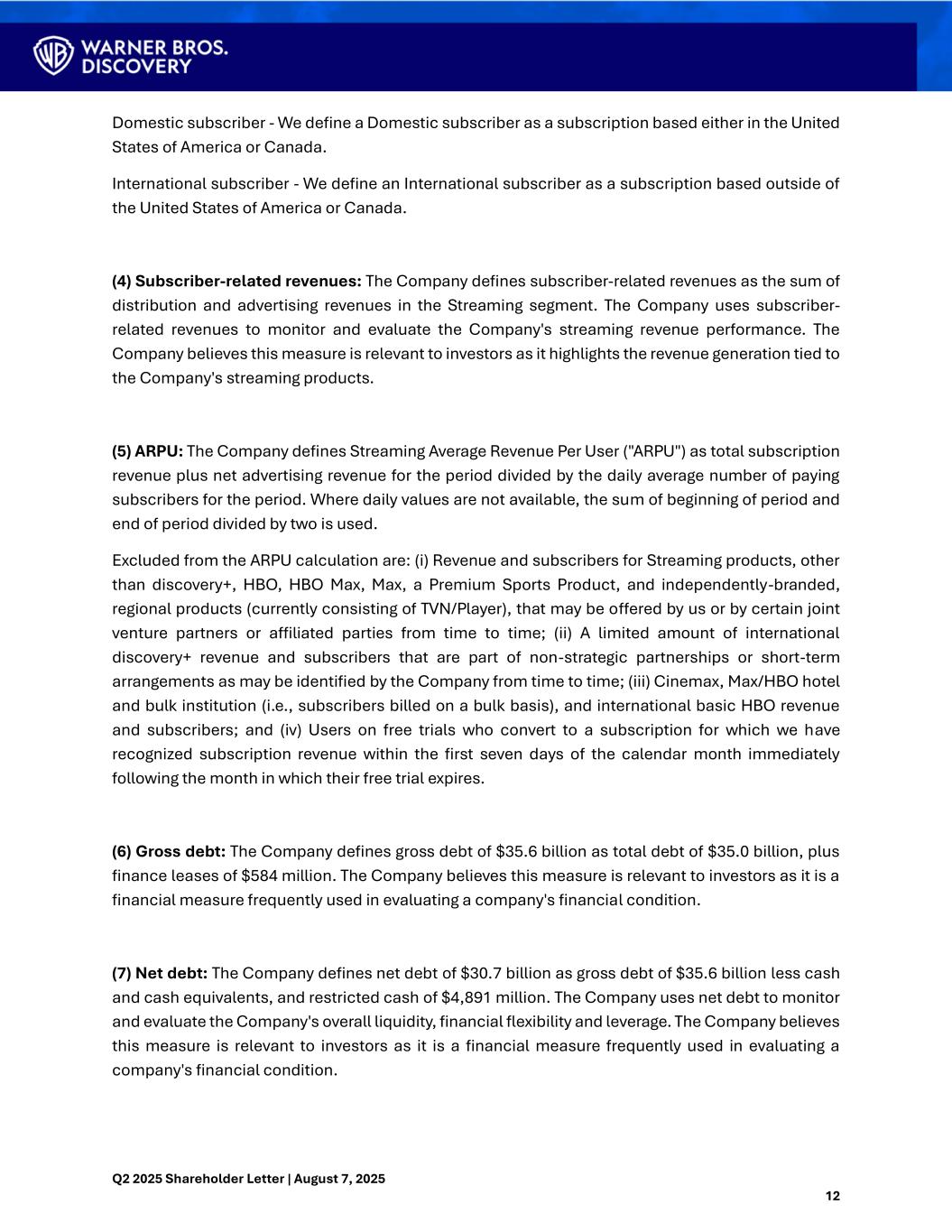 Q2 2025 Shareholder Letter | August 7, 2025 12 Domestic subscriber - We define a Domestic subscriber as a subscription based either in the United States of America or Canada. International subscriber - We define an International subscriber as a subscription based outside of the United States of America or Canada. (4) Subscriber-related revenues: The Company defines subscriber-related revenues as the sum of distribution and advertising revenues in the Streaming segment. The Company uses subscriber- related revenues to monitor and evaluate the Company's streaming revenue performance. The Company believes this measure is relevant to investors as it highlights the revenue generation tied to the Company's streaming products. (5) ARPU: The Company defines Streaming Average Revenue Per User ("ARPU") as total subscription revenue plus net advertising revenue for the period divided by the daily average number of paying subscribers for the period. Where daily values are not available, the sum of beginning of period and end of period divided by two is used. Excluded from the ARPU calculation are: (i) Revenue and subscribers for Streaming products, other than discovery+, HBO, HBO Max, Max, a Premium Sports Product, and independently-branded, regional products (currently consisting of TVN/Player), that may be offered by us or by certain joint venture partners or affiliated parties from time to time; (ii) A limited amount of international discovery+ revenue and subscribers that are part of non-strategic partnerships or short-term arrangements as may be identified by the Company from time to time; (iii) Cinemax, Max/HBO hotel and bulk institution (i.e., subscribers billed on a bulk basis), and international basic HBO revenue and subscribers; and (iv) Users on free trials who convert to a subscription for which we have recognized subscription revenue within the first seven days of the calendar month immediately following the month in which their free trial expires. (6) Gross debt: The Company defines gross debt of $35.6 billion as total debt of $35.0 billion, plus finance leases of $584 million. The Company believes this measure is relevant to investors as it is a financial measure frequently used in evaluating a company's financial condition. (7) Net debt: The Company defines net debt of $30.7 billion as gross debt of $35.6 billion less cash and cash equivalents, and restricted cash of $4,891 million. The Company uses net debt to monitor and evaluate the Company's overall liquidity, financial flexibility and leverage. The Company believes this measure is relevant to investors as it is a financial measure frequently used in evaluating a company's financial condition.