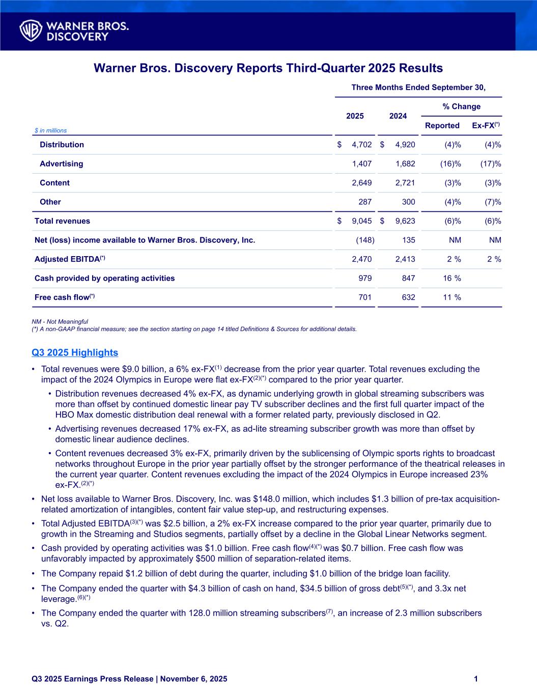 Warner Bros. Discovery Reports Third-Quarter 2025 Results Three Months Ended September 30, 2025 2024 % Change $ in millions Reported Ex-FX(*) Distribution $ 4,702 $ 4,920 (4) % (4) % Advertising 1,407 1,682 (16) % (17) % Content 2,649 2,721 (3) % (3) % Other 287 300 (4) % (7) % Total revenues $ 9,045 $ 9,623 (6) % (6) % Net (loss) income available to Warner Bros. Discovery, Inc. (148) 135 NM NM Adjusted EBITDA(*) 2,470 2,413 2 % 2 % Cash provided by operating activities 979 847 16 % Free cash flow(*) 701 632 11 % NM - Not Meaningful (*) A non-GAAP financial measure; see the section starting on page 14 titled Definitions & Sources for additional details. Q3 2025 Highlights • Total revenues were $9.0 billion, a 6% ex-FX(1) decrease from the prior year quarter. Total revenues excluding the impact of the 2024 Olympics in Europe were flat ex-FX(2)(*) compared to the prior year quarter. • Distribution revenues decreased 4% ex-FX, as dynamic underlying growth in global streaming subscribers was more than offset by continued domestic linear pay TV subscriber declines and the first full quarter impact of the HBO Max domestic distribution deal renewal with a former related party, previously disclosed in Q2. • Advertising revenues decreased 17% ex-FX, as ad-lite streaming subscriber growth was more than offset by domestic linear audience declines. • Content revenues decreased 3% ex-FX, primarily driven by the sublicensing of Olympic sports rights to broadcast networks throughout Europe in the prior year partially offset by the stronger performance of the theatrical releases in the current year quarter. Content revenues excluding the impact of the 2024 Olympics in Europe increased 23% ex-FX.(2)(*) • Net loss available to Warner Bros. Discovery, Inc. was $148.0 million, which includes $1.3 billion of pre-tax acquisition- related amortization of intangibles, content fair value step-up, and restructuring expenses. • Total Adjusted EBITDA(3)(*) was $2.5 billion, a 2% ex-FX increase compared to the prior year quarter, primarily due to growth in the Streaming and Studios segments, partially offset by a decline in the Global Linear Networks segment. • Cash provided by operating activities was $1.0 billion. Free cash flow(4)(*) was $0.7 billion. Free cash flow was unfavorably impacted by approximately $500 million of separation-related items. • The Company repaid $1.2 billion of debt during the quarter, including $1.0 billion of the bridge loan facility. • The Company ended the quarter with $4.3 billion of cash on hand, $34.5 billion of gross debt(5)(*), and 3.3x net leverage.(6)(*) • The Company ended the quarter with 128.0 million streaming subscribers(7), an increase of 2.3 million subscribers vs. Q2. Q3 2025 Earnings Press Release | November 6, 2025 1