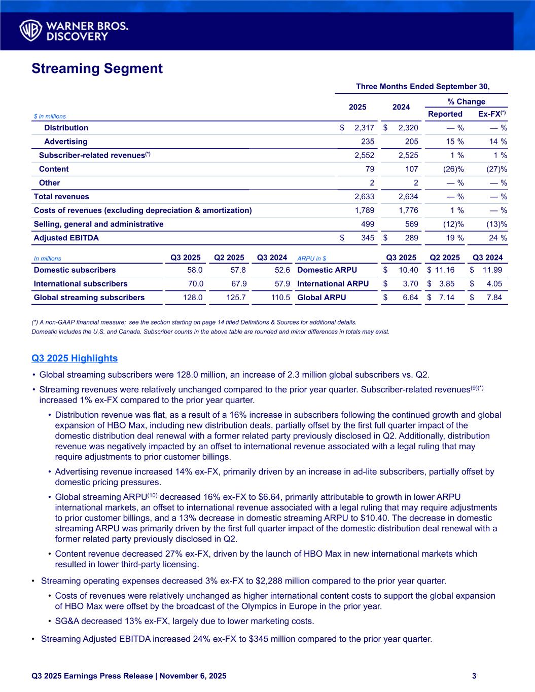 Streaming Segment Three Months Ended September 30, 2025 2024 % Change $ in millions Reported Ex-FX(*) Distribution $ 2,317 $ 2,320 — % — % Advertising 235 205 15 % 14 % Subscriber-related revenues(*) 2,552 2,525 1 % 1 % Content 79 107 (26) % (27) % Other 2 2 — % — % Total revenues 2,633 2,634 — % — % Costs of revenues (excluding depreciation & amortization) 1,789 1,776 1 % — % Selling, general and administrative 499 569 (12) % (13) % Adjusted EBITDA $ 345 $ 289 19 % 24 % In millions Q3 2025 Q2 2025 Q3 2024 ARPU in $ Q3 2025 Q2 2025 Q3 2024 Domestic subscribers 58.0 57.8 52.6 Domestic ARPU $ 10.40 $ 11.16 $ 11.99 International subscribers 70.0 67.9 57.9 International ARPU $ 3.70 $ 3.85 $ 4.05 Global streaming subscribers 128.0 125.7 110.5 Global ARPU $ 6.64 $ 7.14 $ 7.84 (*) A non-GAAP financial measure; see the section starting on page 14 titled Definitions & Sources for additional details. Domestic includes the U.S. and Canada. Subscriber counts in the above table are rounded and minor differences in totals may exist. Q3 2025 Highlights • Global streaming subscribers were 128.0 million, an increase of 2.3 million global subscribers vs. Q2. • Streaming revenues were relatively unchanged compared to the prior year quarter. Subscriber-related revenues(9)(*) increased 1% ex-FX compared to the prior year quarter. • Distribution revenue was flat, as a result of a 16% increase in subscribers following the continued growth and global expansion of HBO Max, including new distribution deals, partially offset by the first full quarter impact of the domestic distribution deal renewal with a former related party previously disclosed in Q2. Additionally, distribution revenue was negatively impacted by an offset to international revenue associated with a legal ruling that may require adjustments to prior customer billings. • Advertising revenue increased 14% ex-FX, primarily driven by an increase in ad-lite subscribers, partially offset by domestic pricing pressures. • Global streaming ARPU(10) decreased 16% ex-FX to $6.64, primarily attributable to growth in lower ARPU international markets, an offset to international revenue associated with a legal ruling that may require adjustments to prior customer billings, and a 13% decrease in domestic streaming ARPU to $10.40. The decrease in domestic streaming ARPU was primarily driven by the first full quarter impact of the domestic distribution deal renewal with a former related party previously disclosed in Q2. • Content revenue decreased 27% ex-FX, driven by the launch of HBO Max in new international markets which resulted in lower third-party licensing. • Streaming operating expenses decreased 3% ex-FX to $2,288 million compared to the prior year quarter. • Costs of revenues were relatively unchanged as higher international content costs to support the global expansion of HBO Max were offset by the broadcast of the Olympics in Europe in the prior year. • SG&A decreased 13% ex-FX, largely due to lower marketing costs. • Streaming Adjusted EBITDA increased 24% ex-FX to $345 million compared to the prior year quarter. Q3 2025 Earnings Press Release | November 6, 2025 3