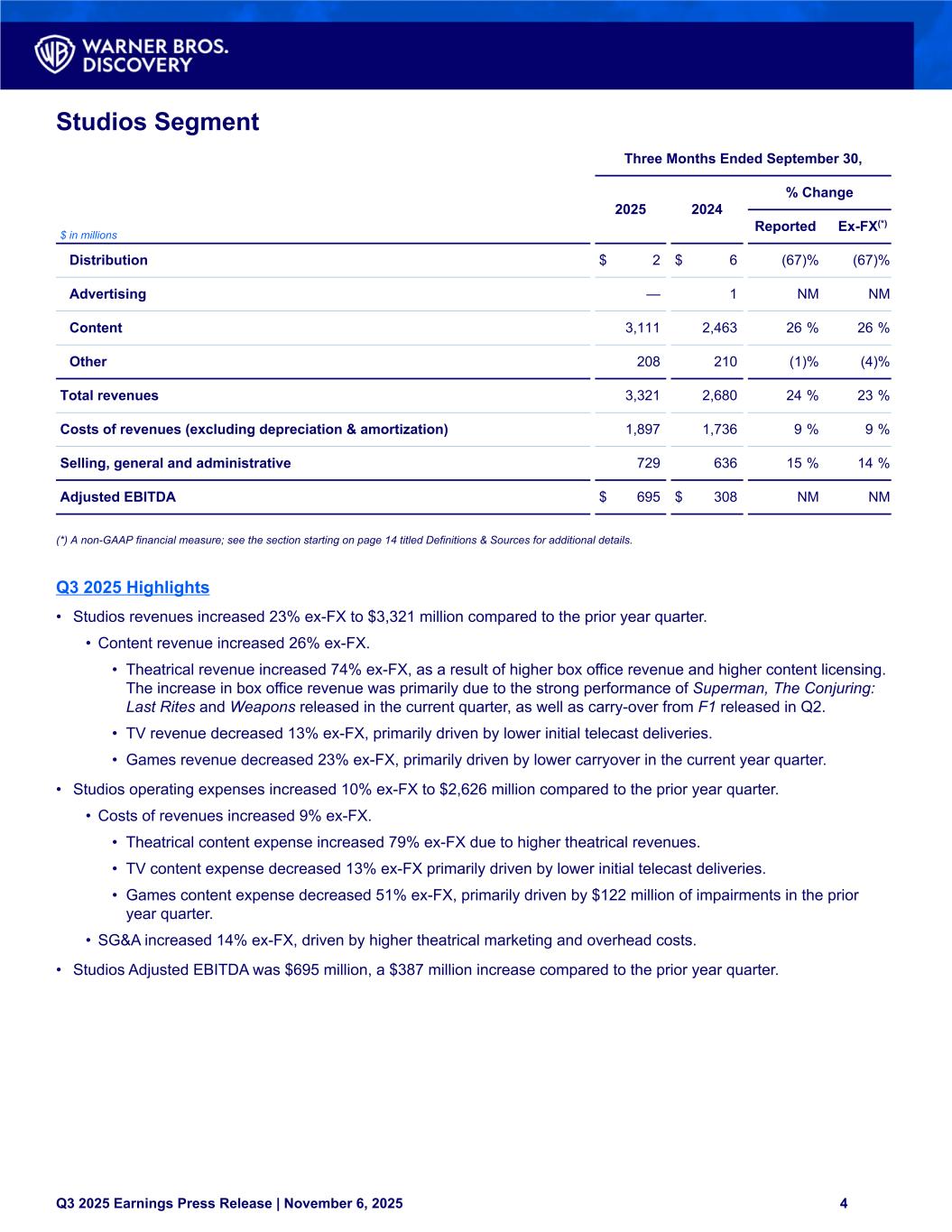 Studios Segment Three Months Ended September 30, 2025 2024 % Change $ in millions Reported Ex-FX(*) Distribution $ 2 $ 6 (67) % (67) % Advertising — 1 NM NM Content 3,111 2,463 26 % 26 % Other 208 210 (1) % (4) % Total revenues 3,321 2,680 24 % 23 % Costs of revenues (excluding depreciation & amortization) 1,897 1,736 9 % 9 % Selling, general and administrative 729 636 15 % 14 % Adjusted EBITDA $ 695 $ 308 NM NM (*) A non-GAAP financial measure; see the section starting on page 14 titled Definitions & Sources for additional details. Q3 2025 Highlights • Studios revenues increased 23% ex-FX to $3,321 million compared to the prior year quarter. • Content revenue increased 26% ex-FX. • Theatrical revenue increased 74% ex-FX, as a result of higher box office revenue and higher content licensing. The increase in box office revenue was primarily due to the strong performance of Superman, The Conjuring: Last Rites and Weapons released in the current quarter, as well as carry-over from F1 released in Q2. • TV revenue decreased 13% ex-FX, primarily driven by lower initial telecast deliveries. • Games revenue decreased 23% ex-FX, primarily driven by lower carryover in the current year quarter. • Studios operating expenses increased 10% ex-FX to $2,626 million compared to the prior year quarter. • Costs of revenues increased 9% ex-FX. • Theatrical content expense increased 79% ex-FX due to higher theatrical revenues. • TV content expense decreased 13% ex-FX primarily driven by lower initial telecast deliveries. • Games content expense decreased 51% ex-FX, primarily driven by $122 million of impairments in the prior year quarter. • SG&A increased 14% ex-FX, driven by higher theatrical marketing and overhead costs. • Studios Adjusted EBITDA was $695 million, a $387 million increase compared to the prior year quarter. Q3 2025 Earnings Press Release | November 6, 2025 4