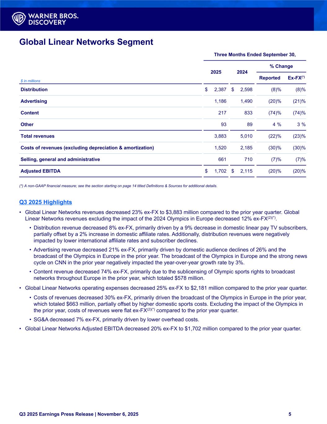 Global Linear Networks Segment Three Months Ended September 30, 2025 2024 % Change $ in millions Reported Ex-FX(*) Distribution $ 2,387 $ 2,598 (8) % (8) % Advertising 1,186 1,490 (20) % (21) % Content 217 833 (74) % (74) % Other 93 89 4 % 3 % Total revenues 3,883 5,010 (22) % (23) % Costs of revenues (excluding depreciation & amortization) 1,520 2,185 (30) % (30) % Selling, general and administrative 661 710 (7) % (7) % Adjusted EBITDA $ 1,702 $ 2,115 (20) % (20) % (*) A non-GAAP financial measure; see the section starting on page 14 titled Definitions & Sources for additional details. Q3 2025 Highlights • Global Linear Networks revenues decreased 23% ex-FX to $3,883 million compared to the prior year quarter. Global Linear Networks revenues excluding the impact of the 2024 Olympics in Europe decreased 12% ex-FX(2)(*). • Distribution revenue decreased 8% ex-FX, primarily driven by a 9% decrease in domestic linear pay TV subscribers, partially offset by a 2% increase in domestic affiliate rates. Additionally, distribution revenues were negatively impacted by lower international affiliate rates and subscriber declines. • Advertising revenue decreased 21% ex-FX, primarily driven by domestic audience declines of 26% and the broadcast of the Olympics in Europe in the prior year. The broadcast of the Olympics in Europe and the strong news cycle on CNN in the prior year negatively impacted the year-over-year growth rate by 3%. • Content revenue decreased 74% ex-FX, primarily due to the sublicensing of Olympic sports rights to broadcast networks throughout Europe in the prior year, which totaled $578 million. • Global Linear Networks operating expenses decreased 25% ex-FX to $2,181 million compared to the prior year quarter. • Costs of revenues decreased 30% ex-FX, primarily driven the broadcast of the Olympics in Europe in the prior year, which totaled $663 million, partially offset by higher domestic sports costs. Excluding the impact of the Olympics in the prior year, costs of revenues were flat ex-FX(2)(*) compared to the prior year quarter. • SG&A decreased 7% ex-FX, primarily driven by lower overhead costs. • Global Linear Networks Adjusted EBITDA decreased 20% ex-FX to $1,702 million compared to the prior year quarter. Q3 2025 Earnings Press Release | November 6, 2025 5