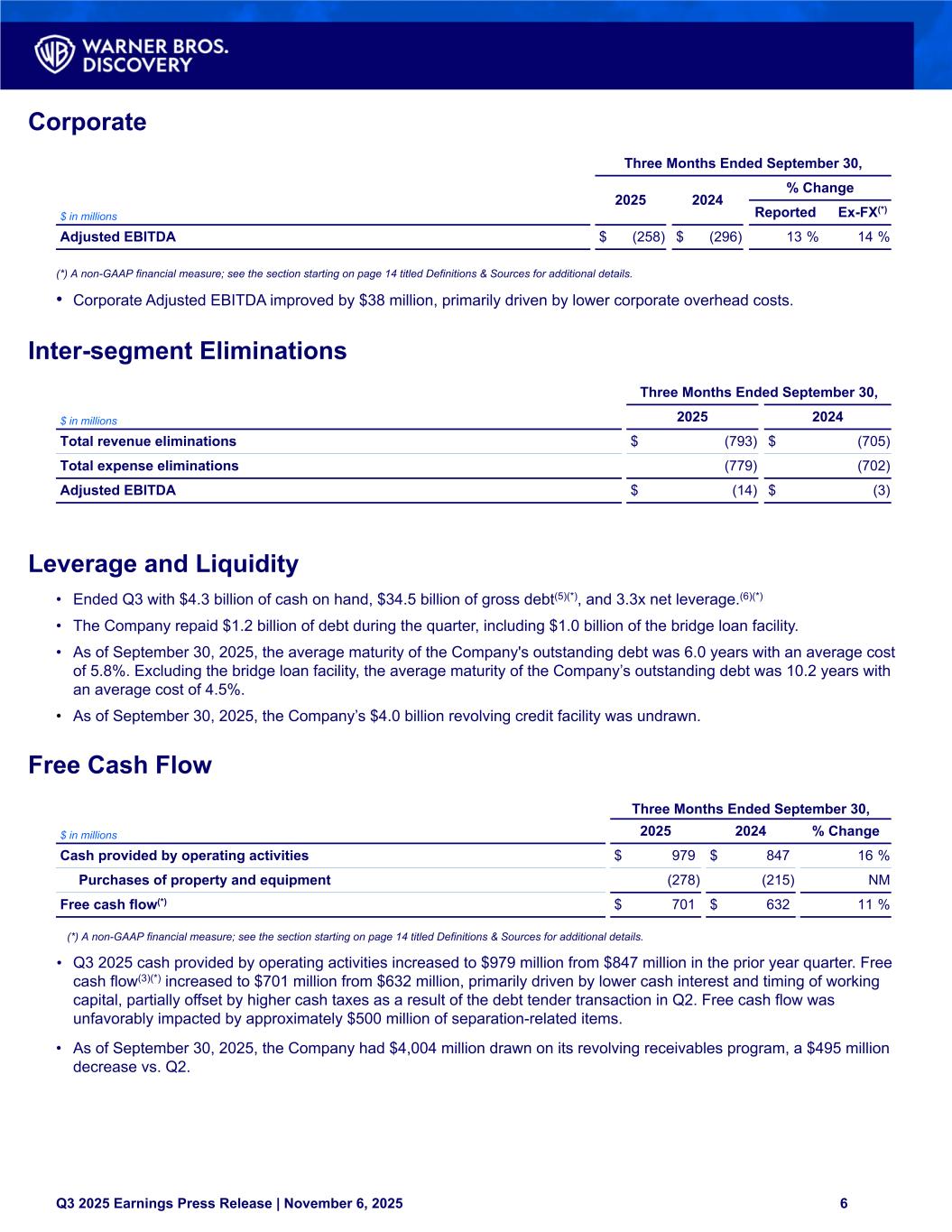 Corporate Three Months Ended September 30, 2025 2024 % Change $ in millions Reported Ex-FX(*) Adjusted EBITDA $ (258) $ (296) 13 % 14 % (*) A non-GAAP financial measure; see the section starting on page 14 titled Definitions & Sources for additional details. • Corporate Adjusted EBITDA improved by $38 million, primarily driven by lower corporate overhead costs. Inter-segment Eliminations Three Months Ended September 30, $ in millions 2025 2024 Total revenue eliminations $ (793) $ (705) Total expense eliminations (779) (702) Adjusted EBITDA $ (14) $ (3) Leverage and Liquidity • Ended Q3 with $4.3 billion of cash on hand, $34.5 billion of gross debt(5)(*), and 3.3x net leverage.(6)(*) • The Company repaid $1.2 billion of debt during the quarter, including $1.0 billion of the bridge loan facility. • As of September 30, 2025, the average maturity of the Company's outstanding debt was 6.0 years with an average cost of 5.8%. Excluding the bridge loan facility, the average maturity of the Company’s outstanding debt was 10.2 years with an average cost of 4.5%. • As of September 30, 2025, the Company’s $4.0 billion revolving credit facility was undrawn. Free Cash Flow Three Months Ended September 30, $ in millions 2025 2024 % Change Cash provided by operating activities $ 979 $ 847 16 % Purchases of property and equipment (278) (215) NM Free cash flow(*) $ 701 $ 632 11 % (*) A non-GAAP financial measure; see the section starting on page 14 titled Definitions & Sources for additional details. • Q3 2025 cash provided by operating activities increased to $979 million from $847 million in the prior year quarter. Free cash flow(3)(*) increased to $701 million from $632 million, primarily driven by lower cash interest and timing of working capital, partially offset by higher cash taxes as a result of the debt tender transaction in Q2. Free cash flow was unfavorably impacted by approximately $500 million of separation-related items. • As of September 30, 2025, the Company had $4,004 million drawn on its revolving receivables program, a $495 million decrease vs. Q2. Q3 2025 Earnings Press Release | November 6, 2025 6