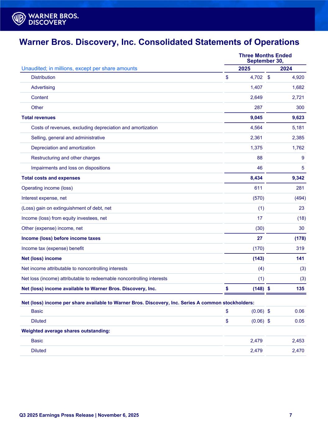 Warner Bros. Discovery, Inc. Consolidated Statements of Operations Three Months Ended September 30, Unaudited; in millions, except per share amounts 2025 2024 Distribution $ 4,702 $ 4,920 Advertising 1,407 1,682 Content 2,649 2,721 Other 287 300 Total revenues 9,045 9,623 Costs of revenues, excluding depreciation and amortization 4,564 5,181 Selling, general and administrative 2,361 2,385 Depreciation and amortization 1,375 1,762 Restructuring and other charges 88 9 Impairments and loss on dispositions 46 5 Total costs and expenses 8,434 9,342 Operating income (loss) 611 281 Interest expense, net (570) (494) (Loss) gain on extinguishment of debt, net (1) 23 Income (loss) from equity investees, net 17 (18) Other (expense) income, net (30) 30 Income (loss) before income taxes 27 (178) Income tax (expense) benefit (170) 319 Net (loss) income (143) 141 Net income attributable to noncontrolling interests (4) (3) Net loss (income) attributable to redeemable noncontrolling interests (1) (3) Net (loss) income available to Warner Bros. Discovery, Inc. $ (148) $ 135 Net (loss) income per share available to Warner Bros. Discovery, Inc. Series A common stockholders: Basic $ (0.06) $ 0.06 Diluted $ (0.06) $ 0.05 Weighted average shares outstanding: Basic 2,479 2,453 Diluted 2,479 2,470 Q3 2025 Earnings Press Release | November 6, 2025 7