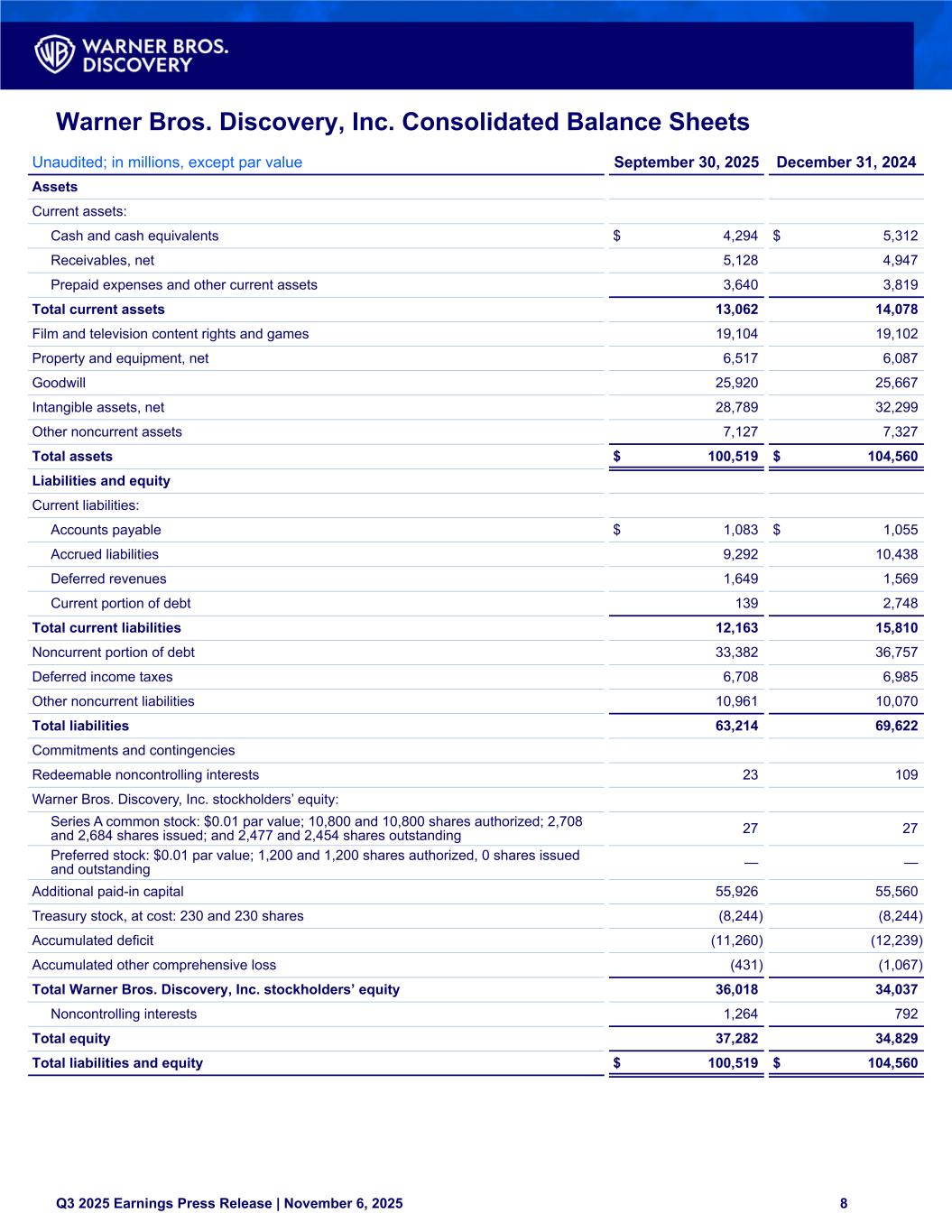 Warner Bros. Discovery, Inc. Consolidated Balance Sheets Unaudited; in millions, except par value September 30, 2025 December 31, 2024 Assets Current assets: Cash and cash equivalents $ 4,294 $ 5,312 Receivables, net 5,128 4,947 Prepaid expenses and other current assets 3,640 3,819 Total current assets 13,062 14,078 Film and television content rights and games 19,104 19,102 Property and equipment, net 6,517 6,087 Goodwill 25,920 25,667 Intangible assets, net 28,789 32,299 Other noncurrent assets 7,127 7,327 Total assets $ 100,519 $ 104,560 Liabilities and equity Current liabilities: Accounts payable $ 1,083 $ 1,055 Accrued liabilities 9,292 10,438 Deferred revenues 1,649 1,569 Current portion of debt 139 2,748 Total current liabilities 12,163 15,810 Noncurrent portion of debt 33,382 36,757 Deferred income taxes 6,708 6,985 Other noncurrent liabilities 10,961 10,070 Total liabilities 63,214 69,622 Commitments and contingencies Redeemable noncontrolling interests 23 109 Warner Bros. Discovery, Inc. stockholders’ equity: Series A common stock: $0.01 par value; 10,800 and 10,800 shares authorized; 2,708 and 2,684 shares issued; and 2,477 and 2,454 shares outstanding 27 27 Preferred stock: $0.01 par value; 1,200 and 1,200 shares authorized, 0 shares issued and outstanding — — Additional paid-in capital 55,926 55,560 Treasury stock, at cost: 230 and 230 shares (8,244) (8,244) Accumulated deficit (11,260) (12,239) Accumulated other comprehensive loss (431) (1,067) Total Warner Bros. Discovery, Inc. stockholders’ equity 36,018 34,037 Noncontrolling interests 1,264 792 Total equity 37,282 34,829 Total liabilities and equity $ 100,519 $ 104,560 Q3 2025 Earnings Press Release | November 6, 2025 8