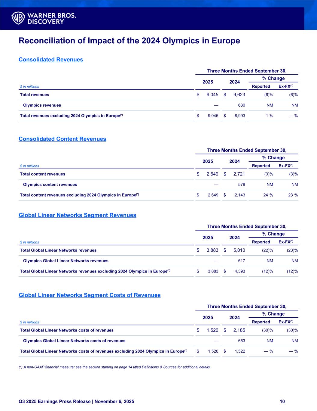 Reconciliation of Impact of the 2024 Olympics in Europe Consolidated Revenues Three Months Ended September 30, 2025 2024 % Change $ in millions Reported Ex-FX(*) Total revenues $ 9,045 $ 9,623 (6) % (6) % Olympics revenues — 630 NM NM Total revenues excluding 2024 Olympics in Europe(*) $ 9,045 $ 8,993 1 % — % Consolidated Content Revenues Three Months Ended September 30, 2025 2024 % Change $ in millions Reported Ex-FX(*) Total content revenues $ 2,649 $ 2,721 (3) % (3) % Olympics content revenues — 578 NM NM Total content revenues excluding 2024 Olympics in Europe(*) $ 2,649 $ 2,143 24 % 23 % Global Linear Networks Segment Revenues Three Months Ended September 30, 2025 2024 % Change $ in millions Reported Ex-FX(*) Total Global Linear Networks revenues $ 3,883 $ 5,010 (22) % (23) % Olympics Global Linear Networks revenues — 617 NM NM Total Global Linear Networks revenues excluding 2024 Olympics in Europe(*) $ 3,883 $ 4,393 (12) % (12) % Global Linear Networks Segment Costs of Revenues Three Months Ended September 30, 2025 2024 % Change $ in millions Reported Ex-FX(*) Total Global Linear Networks costs of revenues $ 1,520 $ 2,185 (30) % (30) % Olympics Global Linear Networks costs of revenues — 663 NM NM Total Global Linear Networks costs of revenues excluding 2024 Olympics in Europe(*) $ 1,520 $ 1,522 — % — % (*) A non-GAAP financial measure; see the section starting on page 14 titled Definitions & Sources for additional details Q3 2025 Earnings Press Release | November 6, 2025 10