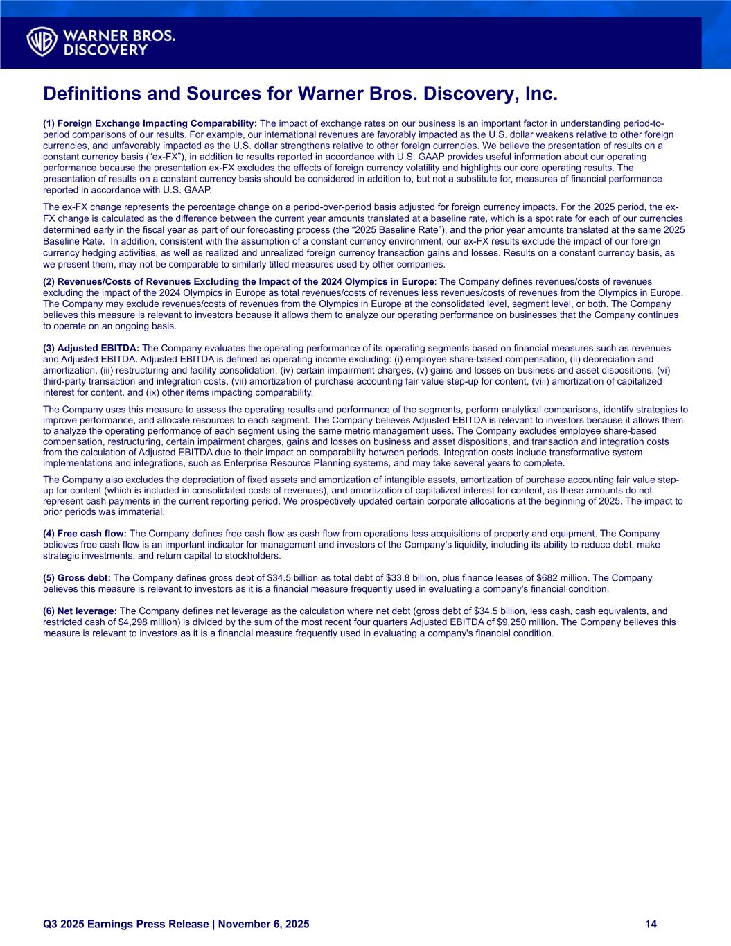 Definitions and Sources for Warner Bros. Discovery, Inc. (1) Foreign Exchange Impacting Comparability: The impact of exchange rates on our business is an important factor in understanding period-to- period comparisons of our results. For example, our international revenues are favorably impacted as the U.S. dollar weakens relative to other foreign currencies, and unfavorably impacted as the U.S. dollar strengthens relative to other foreign currencies. We believe the presentation of results on a constant currency basis (“ex-FX”), in addition to results reported in accordance with U.S. GAAP provides useful information about our operating performance because the presentation ex-FX excludes the effects of foreign currency volatility and highlights our core operating results. The presentation of results on a constant currency basis should be considered in addition to, but not a substitute for, measures of financial performance reported in accordance with U.S. GAAP. The ex-FX change represents the percentage change on a period-over-period basis adjusted for foreign currency impacts. For the 2025 period, the ex- FX change is calculated as the difference between the current year amounts translated at a baseline rate, which is a spot rate for each of our currencies determined early in the fiscal year as part of our forecasting process (the “2025 Baseline Rate”), and the prior year amounts translated at the same 2025 Baseline Rate. In addition, consistent with the assumption of a constant currency environment, our ex-FX results exclude the impact of our foreign currency hedging activities, as well as realized and unrealized foreign currency transaction gains and losses. Results on a constant currency basis, as we present them, may not be comparable to similarly titled measures used by other companies. (2) Revenues/Costs of Revenues Excluding the Impact of the 2024 Olympics in Europe: The Company defines revenues/costs of revenues excluding the impact of the 2024 Olympics in Europe as total revenues/costs of revenues less revenues/costs of revenues from the Olympics in Europe. The Company may exclude revenues/costs of revenues from the Olympics in Europe at the consolidated level, segment level, or both. The Company believes this measure is relevant to investors because it allows them to analyze our operating performance on businesses that the Company continues to operate on an ongoing basis. (3) Adjusted EBITDA: The Company evaluates the operating performance of its operating segments based on financial measures such as revenues and Adjusted EBITDA. Adjusted EBITDA is defined as operating income excluding: (i) employee share-based compensation, (ii) depreciation and amortization, (iii) restructuring and facility consolidation, (iv) certain impairment charges, (v) gains and losses on business and asset dispositions, (vi) third-party transaction and integration costs, (vii) amortization of purchase accounting fair value step-up for content, (viii) amortization of capitalized interest for content, and (ix) other items impacting comparability. The Company uses this measure to assess the operating results and performance of the segments, perform analytical comparisons, identify strategies to improve performance, and allocate resources to each segment. The Company believes Adjusted EBITDA is relevant to investors because it allows them to analyze the operating performance of each segment using the same metric management uses. The Company excludes employee share-based compensation, restructuring, certain impairment charges, gains and losses on business and asset dispositions, and transaction and integration costs from the calculation of Adjusted EBITDA due to their impact on comparability between periods. Integration costs include transformative system implementations and integrations, such as Enterprise Resource Planning systems, and may take several years to complete. The Company also excludes the depreciation of fixed assets and amortization of intangible assets, amortization of purchase accounting fair value step- up for content (which is included in consolidated costs of revenues), and amortization of capitalized interest for content, as these amounts do not represent cash payments in the current reporting period. We prospectively updated certain corporate allocations at the beginning of 2025. The impact to prior periods was immaterial. (4) Free cash flow: The Company defines free cash flow as cash flow from operations less acquisitions of property and equipment. The Company believes free cash flow is an important indicator for management and investors of the Company’s liquidity, including its ability to reduce debt, make strategic investments, and return capital to stockholders. (5) Gross debt: The Company defines gross debt of $34.5 billion as total debt of $33.8 billion, plus finance leases of $682 million. The Company believes this measure is relevant to investors as it is a financial measure frequently used in evaluating a company's financial condition. (6) Net leverage: The Company defines net leverage as the calculation where net debt (gross debt of $34.5 billion, less cash, cash equivalents, and restricted cash of $4,298 million) is divided by the sum of the most recent four quarters Adjusted EBITDA of $9,250 million. The Company believes this measure is relevant to investors as it is a financial measure frequently used in evaluating a company's financial condition. Q3 2025 Earnings Press Release | November 6, 2025 14