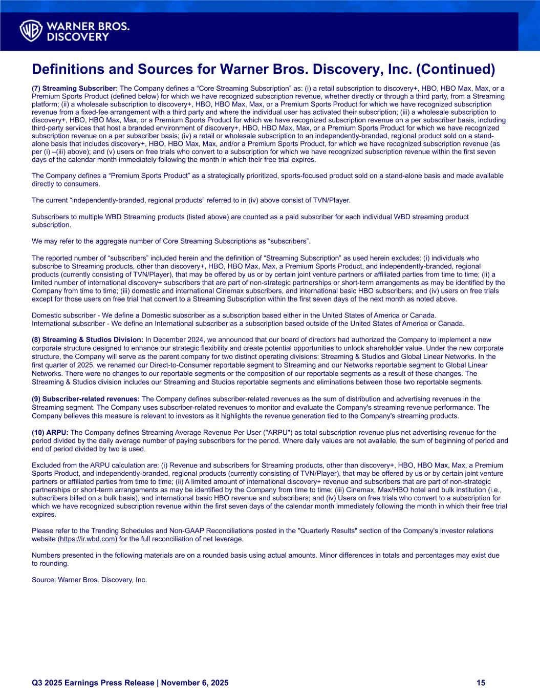 Definitions and Sources for Warner Bros. Discovery, Inc. (Continued) (7) Streaming Subscriber: The Company defines a “Core Streaming Subscription” as: (i) a retail subscription to discovery+, HBO, HBO Max, Max, or a Premium Sports Product (defined below) for which we have recognized subscription revenue, whether directly or through a third party, from a Streaming platform; (ii) a wholesale subscription to discovery+, HBO, HBO Max, Max, or a Premium Sports Product for which we have recognized subscription revenue from a fixed-fee arrangement with a third party and where the individual user has activated their subscription; (iii) a wholesale subscription to discovery+, HBO, HBO Max, Max, or a Premium Sports Product for which we have recognized subscription revenue on a per subscriber basis, including third-party services that host a branded environment of discovery+, HBO, HBO Max, Max, or a Premium Sports Product for which we have recognized subscription revenue on a per subscriber basis; (iv) a retail or wholesale subscription to an independently-branded, regional product sold on a stand- alone basis that includes discovery+, HBO, HBO Max, Max, and/or a Premium Sports Product, for which we have recognized subscription revenue (as per (i) –(iii) above); and (v) users on free trials who convert to a subscription for which we have recognized subscription revenue within the first seven days of the calendar month immediately following the month in which their free trial expires. The Company defines a “Premium Sports Product” as a strategically prioritized, sports-focused product sold on a stand-alone basis and made available directly to consumers. The current “independently-branded, regional products” referred to in (iv) above consist of TVN/Player. Subscribers to multiple WBD Streaming products (listed above) are counted as a paid subscriber for each individual WBD streaming product subscription. We may refer to the aggregate number of Core Streaming Subscriptions as “subscribers”. The reported number of “subscribers” included herein and the definition of “Streaming Subscription” as used herein excludes: (i) individuals who subscribe to Streaming products, other than discovery+, HBO, HBO Max, Max, a Premium Sports Product, and independently-branded, regional products (currently consisting of TVN/Player), that may be offered by us or by certain joint venture partners or affiliated parties from time to time; (ii) a limited number of international discovery+ subscribers that are part of non-strategic partnerships or short-term arrangements as may be identified by the Company from time to time; (iii) domestic and international Cinemax subscribers, and international basic HBO subscribers; and (iv) users on free trials except for those users on free trial that convert to a Streaming Subscription within the first seven days of the next month as noted above. Domestic subscriber - We define a Domestic subscriber as a subscription based either in the United States of America or Canada. International subscriber - We define an International subscriber as a subscription based outside of the United States of America or Canada. (8) Streaming & Studios Division: In December 2024, we announced that our board of directors had authorized the Company to implement a new corporate structure designed to enhance our strategic flexibility and create potential opportunities to unlock shareholder value. Under the new corporate structure, the Company will serve as the parent company for two distinct operating divisions: Streaming & Studios and Global Linear Networks. In the first quarter of 2025, we renamed our Direct-to-Consumer reportable segment to Streaming and our Networks reportable segment to Global Linear Networks. There were no changes to our reportable segments or the composition of our reportable segments as a result of these changes. The Streaming & Studios division includes our Streaming and Studios reportable segments and eliminations between those two reportable segments. (9) Subscriber-related revenues: The Company defines subscriber-related revenues as the sum of distribution and advertising revenues in the Streaming segment. The Company uses subscriber-related revenues to monitor and evaluate the Company's streaming revenue performance. The Company believes this measure is relevant to investors as it highlights the revenue generation tied to the Company's streaming products. (10) ARPU: The Company defines Streaming Average Revenue Per User ("ARPU") as total subscription revenue plus net advertising revenue for the period divided by the daily average number of paying subscribers for the period. Where daily values are not available, the sum of beginning of period and end of period divided by two is used. Excluded from the ARPU calculation are: (i) Revenue and subscribers for Streaming products, other than discovery+, HBO, HBO Max, Max, a Premium Sports Product, and independently-branded, regional products (currently consisting of TVN/Player), that may be offered by us or by certain joint venture partners or affiliated parties from time to time; (ii) A limited amount of international discovery+ revenue and subscribers that are part of non-strategic partnerships or short-term arrangements as may be identified by the Company from time to time; (iii) Cinemax, Max/HBO hotel and bulk institution (i.e., subscribers billed on a bulk basis), and international basic HBO revenue and subscribers; and (iv) Users on free trials who convert to a subscription for which we have recognized subscription revenue within the first seven days of the calendar month immediately following the month in which their free trial expires. Please refer to the Trending Schedules and Non-GAAP Reconciliations posted in the "Quarterly Results" section of the Company's investor relations website (https://ir.wbd.com) for the full reconciliation of net leverage. Numbers presented in the following materials are on a ro