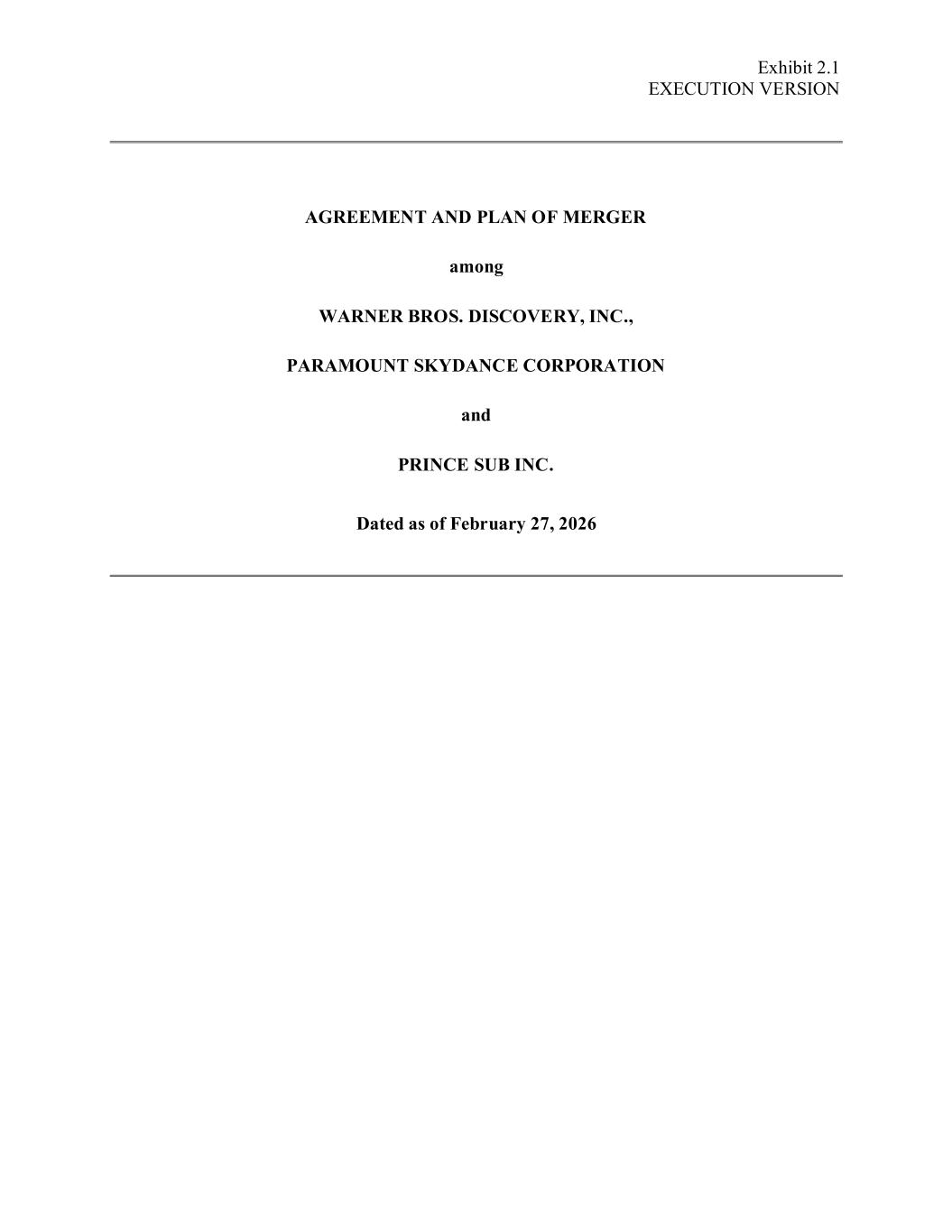 Exhibit 2.1 EXECUTION VERSION AGREEMENT AND PLAN OF MERGER among WARNER BROS. DISCOVERY, INC., PARAMOUNT SKYDANCE CORPORATION and PRINCE SUB INC. Dated as of February 27, 2026