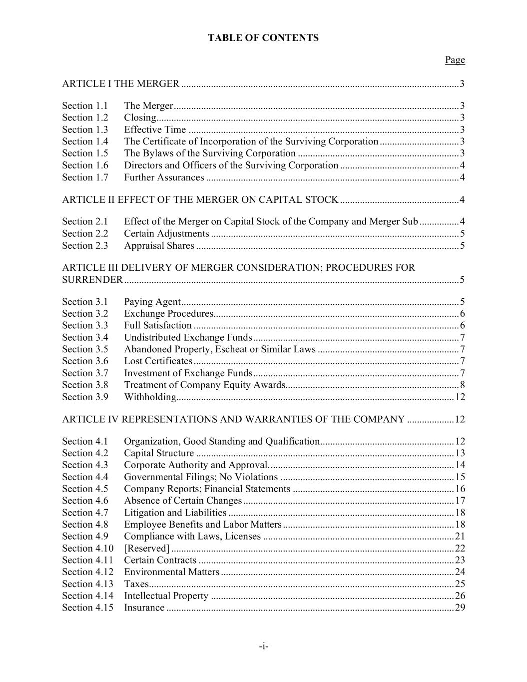 TABLE OF CONTENTS Page -i- ARTICLE I THE MERGER ................................................................................................................ 3 Section 1.1 The Merger ................................................................................................................... 3 Section 1.2 Closing.......................................................................................................................... 3 Section 1.3 Effective Time ............................................................................................................. 3 Section 1.4 The Certificate of Incorporation of the Surviving Corporation ................................ 3 Section 1.5 The Bylaws of the Surviving Corporation ................................................................. 3 Section 1.6 Directors and Officers of the Surviving Corporation ................................................ 4 Section 1.7 Further Assurances ...................................................................................................... 4 ARTICLE II EFFECT OF THE MERGER ON CAPITAL STOCK ................................................ 4 Section 2.1 Effect of the Merger on Capital Stock of the Company and Merger Sub ................ 4 Section 2.2 Certain Adjustments .................................................................................................... 5 Section 2.3 Appraisal Shares .......................................................................................................... 5 ARTICLE III DELIVERY OF MERGER CONSIDERATION; PROCEDURES FOR SURRENDER ....................................................................................................................................... 5 Section 3.1 Paying Agent ................................................................................................................ 5 Section 3.2 Exchange Procedures................................................................................................... 6 Section 3.3 Full Satisfaction ........................................................................................................... 6 Section 3.4 Undistributed Exchange Funds ................................................................................... 7 Section 3.5 Abandoned Property, Escheat or Similar Laws ......................................................... 7 Section 3.6 Lost Certificates ........................................................................................................... 7 Section 3.7 Investment of Exchange Funds ................................................................................... 7 Section 3.8 Treatment of Company Equity Awards...................................................................... 8 Section 3.9 Withholding................................................................................................................ 12 ARTICLE IV REPRESENTATIONS AND WARRANTIES OF THE COMPANY ................... 12 Section 4.1 Organization, Good Standing and Qualification...................................................... 12 Section 4.2 Capital Structure ........................................................................................................ 13 Section 4.3 Corporate Authority and Approval. .......................................................................... 14 Section 4.4 Governmental Filings; No Violations ...................................................................... 15 Section 4.5 Company Reports; Financial Statements ................................................................. 16 Section 4.6 Absence of Certain Changes ..................................................................................... 17 Section 4.7 Litigation and Liabilities ........................................................................................... 18 Section 4.8 Employee Benefits and Labor Matters ..................................................................... 18 Section 4.9 Compliance with Laws, Licenses ............................................................................. 21 Section 4.10 [Reserved] .................................................................................................................. 22 Section 4.11 Certain Contracts ....................................................................................................... 23 Section 4.12 Environmental Matters .............................................................................................. 24 Section 4.13 Taxes........................................................................................................................... 25 Section 4.14 Intellectual Property .................................................................................................. 26 Section 4.15 Insurance .................................................................................................................... 29