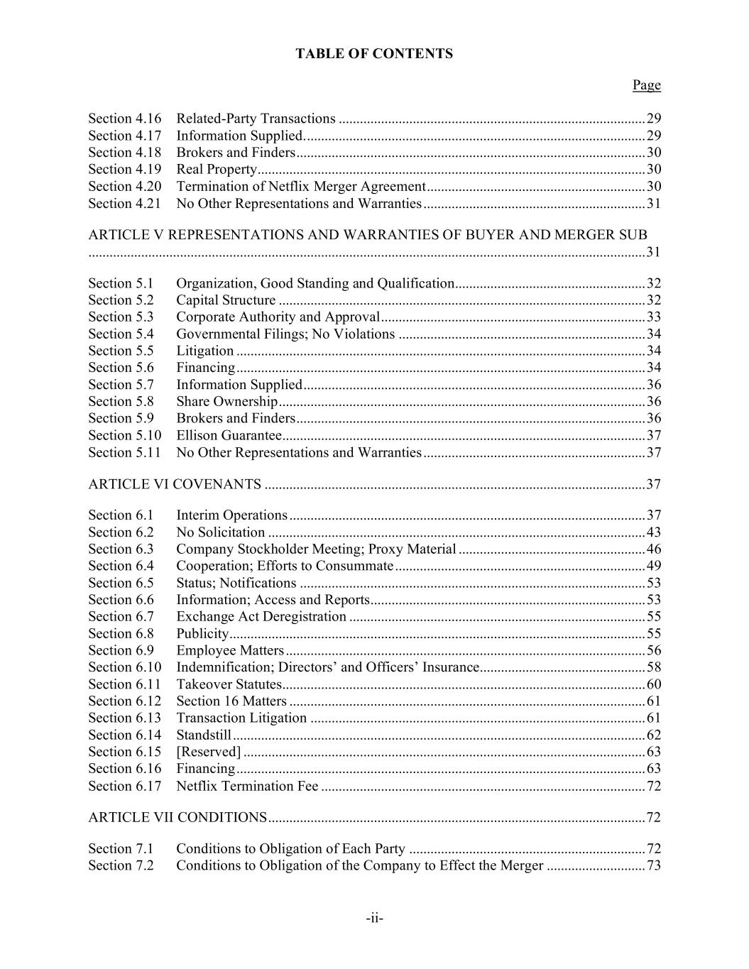 TABLE OF CONTENTS Page -ii- Section 4.16 Related-Party Transactions ....................................................................................... 29 Section 4.17 Information Supplied. ................................................................................................ 29 Section 4.18 Brokers and Finders ................................................................................................... 30 Section 4.19 Real Property.............................................................................................................. 30 Section 4.20 Termination of Netflix Merger Agreement .............................................................. 30 Section 4.21 No Other Representations and Warranties ............................................................... 31 ARTICLE V REPRESENTATIONS AND WARRANTIES OF BUYER AND MERGER SUB .............................................................................................................................................................. 31 Section 5.1 Organization, Good Standing and Qualification...................................................... 32 Section 5.2 Capital Structure ........................................................................................................ 32 Section 5.3 Corporate Authority and Approval ........................................................................... 33 Section 5.4 Governmental Filings; No Violations ...................................................................... 34 Section 5.5 Litigation .................................................................................................................... 34 Section 5.6 Financing .................................................................................................................... 34 Section 5.7 Information Supplied ................................................................................................. 36 Section 5.8 Share Ownership ........................................................................................................ 36 Section 5.9 Brokers and Finders ................................................................................................... 36 Section 5.10 Ellison Guarantee....................................................................................................... 37 Section 5.11 No Other Representations and Warranties ............................................................... 37 ARTICLE VI COVENANTS ............................................................................................................ 37 Section 6.1 Interim Operations ..................................................................................................... 37 Section 6.2 No Solicitation ........................................................................................................... 43 Section 6.3 Company Stockholder Meeting; Proxy Material ..................................................... 46 Section 6.4 Cooperation; Efforts to Consummate ....................................................................... 49 Section 6.5 Status; Notifications .................................................................................................. 53 Section 6.6 Information; Access and Reports.............................................................................. 53 Section 6.7 Exchange Act Deregistration .................................................................................... 55 Section 6.8 Publicity...................................................................................................................... 55 Section 6.9 Employee Matters ...................................................................................................... 56 Section 6.10 Indemnification; Directors’ and Officers’ Insurance............................................... 58 Section 6.11 Takeover Statutes....................................................................................................... 60 Section 6.12 Section 16 Matters ..................................................................................................... 61 Section 6.13 Transaction Litigation ............................................................................................... 61 Section 6.14 Standstill ..................................................................................................................... 62 Section 6.15 [Reserved] .................................................................................................................. 63 Section 6.16 Financing .................................................................................................................... 63 Section 6.17 Netflix Termination Fee ............................................................................................ 72 ARTICLE VII CONDITIONS ........................................................................................................... 72 Section 7.1 Conditions to Obligation of Each Party ................................................................... 72 Section 7.2 Conditions to Obligation of the Company to Effect the Merger ............................ 73