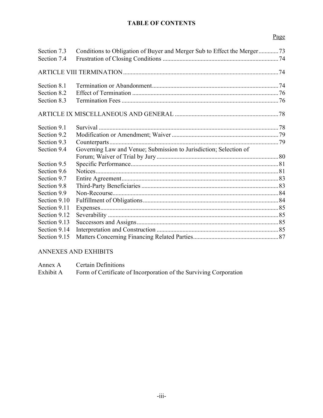 TABLE OF CONTENTS Page -iii- Section 7.3 Conditions to Obligation of Buyer and Merger Sub to Effect the Merger............. 73 Section 7.4 Frustration of Closing Conditions ............................................................................ 74 ARTICLE VIII TERMINATION ...................................................................................................... 74 Section 8.1 Termination or Abandonment ................................................................................... 74 Section 8.2 Effect of Termination ................................................................................................ 76 Section 8.3 Termination Fees ....................................................................................................... 76 ARTICLE IX MISCELLANEOUS AND GENERAL .................................................................... 78 Section 9.1 Survival ...................................................................................................................... 78 Section 9.2 Modification or Amendment; Waiver ...................................................................... 79 Section 9.3 Counterparts ............................................................................................................... 79 Section 9.4 Governing Law and Venue; Submission to Jurisdiction; Selection of Forum; Waiver of Trial by Jury ................................................................................ 80 Section 9.5 Specific Performance................................................................................................. 81 Section 9.6 Notices ........................................................................................................................ 81 Section 9.7 Entire Agreement ....................................................................................................... 83 Section 9.8 Third-Party Beneficiaries .......................................................................................... 83 Section 9.9 Non-Recourse............................................................................................................. 84 Section 9.10 Fulfillment of Obligations ......................................................................................... 84 Section 9.11 Expenses ..................................................................................................................... 85 Section 9.12 Severability ................................................................................................................ 85 Section 9.13 Successors and Assigns ............................................................................................. 85 Section 9.14 Interpretation and Construction ................................................................................ 85 Section 9.15 Matters Concerning Financing Related Parties........................................................ 87 ANNEXES AND EXHIBITS Annex A Certain Definitions Exhibit A Form of Certificate of Incorporation of the Surviving Corporation