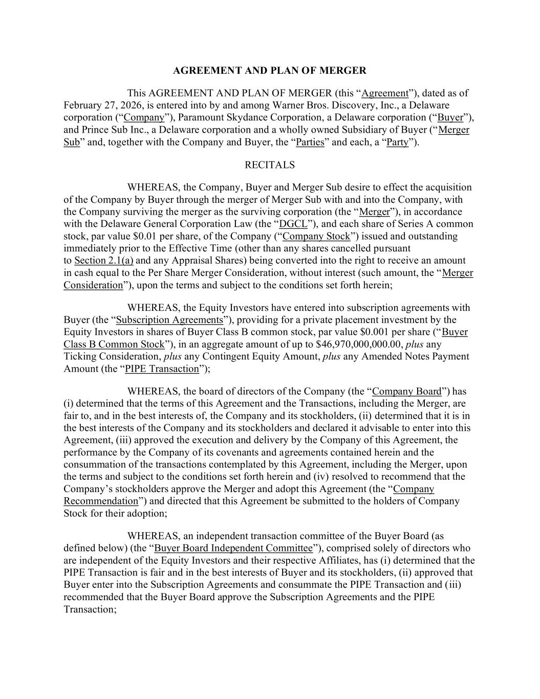 AGREEMENT AND PLAN OF MERGER This AGREEMENT AND PLAN OF MERGER (this “Agreement”), dated as of February 27, 2026, is entered into by and among Warner Bros. Discovery, Inc., a Delaware corporation (“Company”), Paramount Skydance Corporation, a Delaware corporation (“Buyer”), and Prince Sub Inc., a Delaware corporation and a wholly owned Subsidiary of Buyer (“Merger Sub” and, together with the Company and Buyer, the “Parties” and each, a “Party”). RECITALS WHEREAS, the Company, Buyer and Merger Sub desire to effect the acquisition of the Company by Buyer through the merger of Merger Sub with and into the Company, with the Company surviving the merger as the surviving corporation (the “Merger”), in accordance with the Delaware General Corporation Law (the “DGCL”), and each share of Series A common stock, par value $0.01 per share, of the Company (“Company Stock”) issued and outstanding immediately prior to the Effective Time (other than any shares cancelled pursuant to Section 2.1(a) and any Appraisal Shares) being converted into the right to receive an amount in cash equal to the Per Share Merger Consideration, without interest (such amount, the “Merger Consideration”), upon the terms and subject to the conditions set forth herein; WHEREAS, the Equity Investors have entered into subscription agreements with Buyer (the “Subscription Agreements”), providing for a private placement investment by the Equity Investors in shares of Buyer Class B common stock, par value $0.001 per share (“Buyer Class B Common Stock”), in an aggregate amount of up to $46,970,000,000.00, plus any Ticking Consideration, plus any Contingent Equity Amount, plus any Amended Notes Payment Amount (the “PIPE Transaction”); WHEREAS, the board of directors of the Company (the “Company Board”) has (i) determined that the terms of this Agreement and the Transactions, including the Merger, are fair to, and in the best interests of, the Company and its stockholders, (ii) determined that it is in the best interests of the Company and its stockholders and declared it advisable to enter into this Agreement, (iii) approved the execution and delivery by the Company of this Agreement, the performance by the Company of its covenants and agreements contained herein and the consummation of the transactions contemplated by this Agreement, including the Merger, upon the terms and subject to the conditions set forth herein and (iv) resolved to recommend that the Company’s stockholders approve the Merger and adopt this Agreement (the “Company Recommendation”) and directed that this Agreement be submitted to the holders of Company Stock for their adoption; WHEREAS, an independent transaction committee of the Buyer Board (as defined below) (the “Buyer Board Independent Committee”), comprised solely of directors who are independent of the Equity Investors and their respective Affiliates, has (i) determined that the PIPE Transaction is fair and in the best interests of Buyer and its stockholders, (ii) approved that Buyer enter into the Subscription Agreements and consummate the PIPE Transaction and (iii) recommended that the Buyer Board approve the Subscription Agreements and the PIPE Transaction;