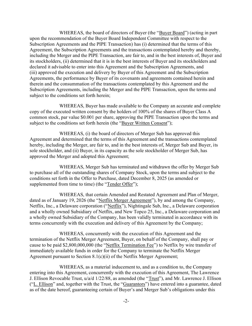 -2- WHEREAS, the board of directors of Buyer (the “Buyer Board”) (acting in part upon the recommendation of the Buyer Board Independent Committee with respect to the Subscription Agreements and the PIPE Transaction) has (i) determined that the terms of this Agreement, the Subscription Agreements and the transactions contemplated hereby and thereby, including the Merger and the PIPE Transaction, are fair to, and in the best interests of, Buyer and its stockholders, (ii) determined that it is in the best interests of Buyer and its stockholders and declared it advisable to enter into this Agreement and the Subscription Agreements, and (iii) approved the execution and delivery by Buyer of this Agreement and the Subscription Agreements, the performance by Buyer of its covenants and agreements contained herein and therein and the consummation of the transactions contemplated by this Agreement and the Subscription Agreements, including the Merger and the PIPE Transaction, upon the terms and subject to the conditions set forth herein; WHEREAS, Buyer has made available to the Company an accurate and complete copy of the executed written consent by the holders of 100% of the shares of Buyer Class A common stock, par value $0.001 per share, approving the PIPE Transaction upon the terms and subject to the conditions set forth herein (the “Buyer Written Consent”); WHEREAS, (i) the board of directors of Merger Sub has approved this Agreement and determined that the terms of this Agreement and the transactions contemplated hereby, including the Merger, are fair to, and in the best interests of, Merger Sub and Buyer, its sole stockholder, and (ii) Buyer, in its capacity as the sole stockholder of Merger Sub, has approved the Merger and adopted this Agreement; WHEREAS, Merger Sub has terminated and withdrawn the offer by Merger Sub to purchase all of the outstanding shares of Company Stock, upon the terms and subject to the conditions set forth in the Offer to Purchase, dated December 8, 2025 (as amended or supplemented from time to time) (the “Tender Offer”); WHEREAS, that certain Amended and Restated Agreement and Plan of Merger, dated as of January 19, 2026 (the “Netflix Merger Agreement”), by and among the Company, Netflix, Inc., a Delaware corporation (“Netflix”), Nightingale Sub, Inc., a Delaware corporation and a wholly owned Subsidiary of Netflix, and New Topco 25, Inc., a Delaware corporation and a wholly owned Subsidiary of the Company, has been validly terminated in accordance with its terms concurrently with the execution and delivery of this Agreement by the Company; WHEREAS, concurrently with the execution of this Agreement and the termination of the Netflix Merger Agreement, Buyer, on behalf of the Company, shall pay or cause to be paid $2,800,000,000 (the “Netflix Termination Fee”) to Netflix by wire transfer of immediately available funds in order for the Company to terminate the Netflix Merger Agreement pursuant to Section 8.1(c)(ii) of the Netflix Merger Agreement; WHEREAS, as a material inducement to, and as a condition to, the Company entering into this Agreement, concurrently with the execution of this Agreement, The Lawrence J. Ellison Revocable Trust, u/a/d 1/22/88, as amended (the “Trust”), and Mr. Lawrence J. Ellison (“L. Ellison” and, together with the Trust, the “Guarantors”) have entered into a guarantee, dated as of the date hereof, guaranteeing certain of Buyer’s and Merger Sub’s obligations under this