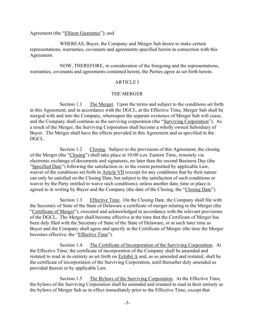 -3- Agreement (the “Ellison Guarantee”); and WHEREAS, Buyer, the Company and Merger Sub desire to make certain representations, warranties, covenants and agreements specified herein in connection with this Agreement. NOW, THEREFORE, in consideration of the foregoing and the representations, warranties, covenants and agreements contained herein, the Parties agree as set forth herein. ARTICLE I THE MERGER Section 1.1 The Merger. Upon the terms and subject to the conditions set forth in this Agreement, and in accordance with the DGCL, at the Effective Time, Merger Sub shall be merged with and into the Company, whereupon the separate existence of Merger Sub will cease, and the Company shall continue as the surviving corporation (the “Surviving Corporation”). As a result of the Merger, the Surviving Corporation shall become a wholly owned Subsidiary of Buyer. The Merger shall have the effects provided in this Agreement and as specified in the DGCL. Section 1.2 Closing. Subject to the provisions of this Agreement, the closing of the Merger (the “Closing”) shall take place at 10:00 a.m. Eastern Time, remotely via electronic exchange of documents and signatures, no later than the second Business Day (the “Specified Date”) following the satisfaction or, to the extent permitted by applicable Law, waiver of the conditions set forth in Article VII (except for any conditions that by their nature can only be satisfied on the Closing Date, but subject to the satisfaction of such conditions or waiver by the Party entitled to waive such conditions), unless another date, time or place is agreed to in writing by Buyer and the Company (the date of the Closing, the “Closing Date”). Section 1.3 Effective Time. On the Closing Date, the Company shall file with the Secretary of State of the State of Delaware a certificate of merger relating to the Merger (the “Certificate of Merger”), executed and acknowledged in accordance with the relevant provisions of the DGCL. The Merger shall become effective at the time that the Certificate of Merger has been duly filed with the Secretary of State of the State of Delaware, or at such later time as Buyer and the Company shall agree and specify in the Certificate of Merger (the time the Merger becomes effective, the “Effective Time”). Section 1.4 The Certificate of Incorporation of the Surviving Corporation. At the Effective Time, the certificate of incorporation of the Company shall be amended and restated to read in its entirety as set forth on Exhibit A and, as so amended and restated, shall be the certificate of incorporation of the Surviving Corporation, until thereafter duly amended as provided therein or by applicable Law. Section 1.5 The Bylaws of the Surviving Corporation. At the Effective Time, the bylaws of the Surviving Corporation shall be amended and restated to read in their entirety as the bylaws of Merger Sub as in effect immediately prior to the Effective Time, except that