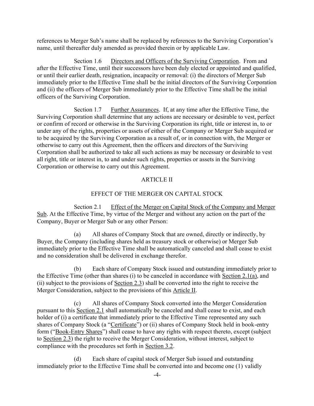-4- references to Merger Sub’s name shall be replaced by references to the Surviving Corporation’s name, until thereafter duly amended as provided therein or by applicable Law. Section 1.6 Directors and Officers of the Surviving Corporation. From and after the Effective Time, until their successors have been duly elected or appointed and qualified, or until their earlier death, resignation, incapacity or removal: (i) the directors of Merger Sub immediately prior to the Effective Time shall be the initial directors of the Surviving Corporation and (ii) the officers of Merger Sub immediately prior to the Effective Time shall be the initial officers of the Surviving Corporation. Section 1.7 Further Assurances. If, at any time after the Effective Time, the Surviving Corporation shall determine that any actions are necessary or desirable to vest, perfect or confirm of record or otherwise in the Surviving Corporation its right, title or interest in, to or under any of the rights, properties or assets of either of the Company or Merger Sub acquired or to be acquired by the Surviving Corporation as a result of, or in connection with, the Merger or otherwise to carry out this Agreement, then the officers and directors of the Surviving Corporation shall be authorized to take all such actions as may be necessary or desirable to vest all right, title or interest in, to and under such rights, properties or assets in the Surviving Corporation or otherwise to carry out this Agreement. ARTICLE II EFFECT OF THE MERGER ON CAPITAL STOCK Section 2.1 Effect of the Merger on Capital Stock of the Company and Merger Sub. At the Effective Time, by virtue of the Merger and without any action on the part of the Company, Buyer or Merger Sub or any other Person: (a) All shares of Company Stock that are owned, directly or indirectly, by Buyer, the Company (including shares held as treasury stock or otherwise) or Merger Sub immediately prior to the Effective Time shall be automatically canceled and shall cease to exist and no consideration shall be delivered in exchange therefor. (b) Each share of Company Stock issued and outstanding immediately prior to the Effective Time (other than shares (i) to be canceled in accordance with Section 2.1(a), and (ii) subject to the provisions of Section 2.3) shall be converted into the right to receive the Merger Consideration, subject to the provisions of this Article II. (c) All shares of Company Stock converted into the Merger Consideration pursuant to this Section 2.1 shall automatically be canceled and shall cease to exist, and each holder of (i) a certificate that immediately prior to the Effective Time represented any such shares of Company Stock (a “Certificate”) or (ii) shares of Company Stock held in book-entry form (“Book-Entry Shares”) shall cease to have any rights with respect thereto, except (subject to Section 2.3) the right to receive the Merger Consideration, without interest, subject to compliance with the procedures set forth in Section 3.2. (d) Each share of capital stock of Merger Sub issued and outstanding immediately prior to the Effective Time shall be converted into and become one (1) validly