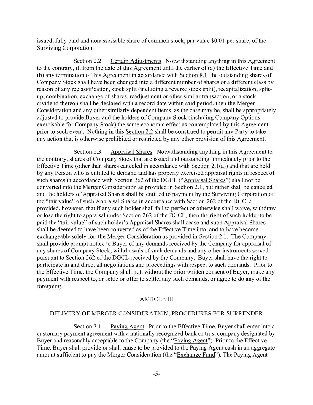 -5- issued, fully paid and nonassessable share of common stock, par value $0.01 per share, of the Surviving Corporation. Section 2.2 Certain Adjustments. Notwithstanding anything in this Agreement to the contrary, if, from the date of this Agreement until the earlier of (a) the Effective Time and (b) any termination of this Agreement in accordance with Section 8.1, the outstanding shares of Company Stock shall have been changed into a different number of shares or a different class by reason of any reclassification, stock split (including a reverse stock split), recapitalization, split- up, combination, exchange of shares, readjustment or other similar transaction, or a stock dividend thereon shall be declared with a record date within said period, then the Merger Consideration and any other similarly dependent items, as the case may be, shall be appropriately adjusted to provide Buyer and the holders of Company Stock (including Company Options exercisable for Company Stock) the same economic effect as contemplated by this Agreement prior to such event. Nothing in this Section 2.2 shall be construed to permit any Party to take any action that is otherwise prohibited or restricted by any other provision of this Agreement. Section 2.3 Appraisal Shares. Notwithstanding anything in this Agreement to the contrary, shares of Company Stock that are issued and outstanding immediately prior to the Effective Time (other than shares canceled in accordance with Section 2.1(a)) and that are held by any Person who is entitled to demand and has properly exercised appraisal rights in respect of such shares in accordance with Section 262 of the DGCL (“Appraisal Shares”) shall not be converted into the Merger Consideration as provided in Section 2.1, but rather shall be canceled and the holders of Appraisal Shares shall be entitled to payment by the Surviving Corporation of the “fair value” of such Appraisal Shares in accordance with Section 262 of the DGCL; provided, however, that if any such holder shall fail to perfect or otherwise shall waive, withdraw or lose the right to appraisal under Section 262 of the DGCL, then the right of such holder to be paid the “fair value” of such holder’s Appraisal Shares shall cease and such Appraisal Shares shall be deemed to have been converted as of the Effective Time into, and to have become exchangeable solely for, the Merger Consideration as provided in Section 2.1. The Company shall provide prompt notice to Buyer of any demands received by the Company for appraisal of any shares of Company Stock, withdrawals of such demands and any other instruments served pursuant to Section 262 of the DGCL received by the Company. Buyer shall have the right to participate in and direct all negotiations and proceedings with respect to such demands. Prior to the Effective Time, the Company shall not, without the prior written consent of Buyer, make any payment with respect to, or settle or offer to settle, any such demands, or agree to do any of the foregoing. ARTICLE III DELIVERY OF MERGER CONSIDERATION; PROCEDURES FOR SURRENDER Section 3.1 Paying Agent. Prior to the Effective Time, Buyer shall enter into a customary payment agreement with a nationally recognized bank or trust company designated by Buyer and reasonably acceptable to the Company (the “Paying Agent”). Prior to the Effective Time, Buyer shall provide or shall cause to be provided to the Paying Agent cash in an aggregate amount sufficient to pay the Merger Consideration (the “Exchange Fund”). The Paying Agent