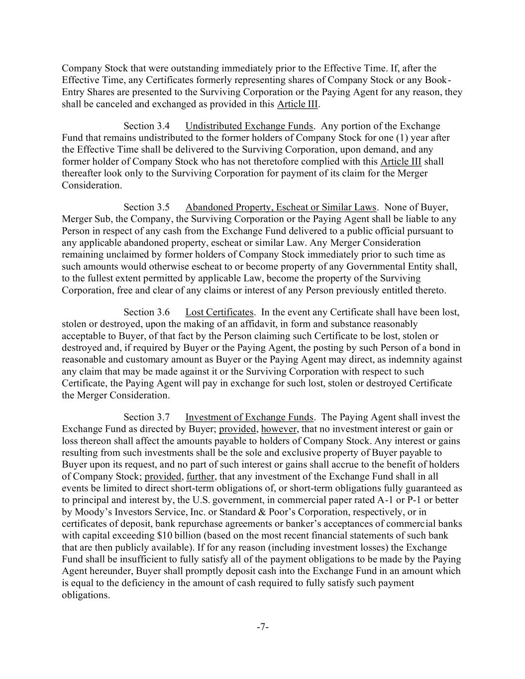 -7- Company Stock that were outstanding immediately prior to the Effective Time. If, after the Effective Time, any Certificates formerly representing shares of Company Stock or any Book- Entry Shares are presented to the Surviving Corporation or the Paying Agent for any reason, they shall be canceled and exchanged as provided in this Article III. Section 3.4 Undistributed Exchange Funds. Any portion of the Exchange Fund that remains undistributed to the former holders of Company Stock for one (1) year after the Effective Time shall be delivered to the Surviving Corporation, upon demand, and any former holder of Company Stock who has not theretofore complied with this Article III shall thereafter look only to the Surviving Corporation for payment of its claim for the Merger Consideration. Section 3.5 Abandoned Property, Escheat or Similar Laws. None of Buyer, Merger Sub, the Company, the Surviving Corporation or the Paying Agent shall be liable to any Person in respect of any cash from the Exchange Fund delivered to a public official pursuant to any applicable abandoned property, escheat or similar Law. Any Merger Consideration remaining unclaimed by former holders of Company Stock immediately prior to such time as such amounts would otherwise escheat to or become property of any Governmental Entity shall, to the fullest extent permitted by applicable Law, become the property of the Surviving Corporation, free and clear of any claims or interest of any Person previously entitled thereto. Section 3.6 Lost Certificates. In the event any Certificate shall have been lost, stolen or destroyed, upon the making of an affidavit, in form and substance reasonably acceptable to Buyer, of that fact by the Person claiming such Certificate to be lost, stolen or destroyed and, if required by Buyer or the Paying Agent, the posting by such Person of a bond in reasonable and customary amount as Buyer or the Paying Agent may direct, as indemnity against any claim that may be made against it or the Surviving Corporation with respect to such Certificate, the Paying Agent will pay in exchange for such lost, stolen or destroyed Certificate the Merger Consideration. Section 3.7 Investment of Exchange Funds. The Paying Agent shall invest the Exchange Fund as directed by Buyer; provided, however, that no investment interest or gain or loss thereon shall affect the amounts payable to holders of Company Stock. Any interest or gains resulting from such investments shall be the sole and exclusive property of Buyer payable to Buyer upon its request, and no part of such interest or gains shall accrue to the benefit of holders of Company Stock; provided, further, that any investment of the Exchange Fund shall in all events be limited to direct short-term obligations of, or short-term obligations fully guaranteed as to principal and interest by, the U.S. government, in commercial paper rated A-1 or P-1 or better by Moody’s Investors Service, Inc. or Standard & Poor’s Corporation, respectively, or in certificates of deposit, bank repurchase agreements or banker’s acceptances of commercial banks with capital exceeding $10 billion (based on the most recent financial statements of such bank that are then publicly available). If for any reason (including investment losses) the Exchange Fund shall be insufficient to fully satisfy all of the payment obligations to be made by the Paying Agent hereunder, Buyer shall promptly deposit cash into the Exchange Fund in an amount which is equal to the deficiency in the amount of cash required to fully satisfy such payment obligations.