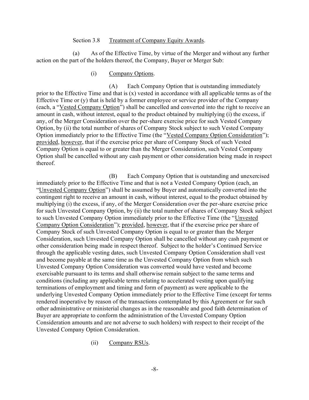 -8- Section 3.8 Treatment of Company Equity Awards. (a) As of the Effective Time, by virtue of the Merger and without any further action on the part of the holders thereof, the Company, Buyer or Merger Sub: (i) Company Options. (A) Each Company Option that is outstanding immediately prior to the Effective Time and that is (x) vested in accordance with all applicable terms as of the Effective Time or (y) that is held by a former employee or service provider of the Company (each, a “Vested Company Option”) shall be cancelled and converted into the right to receive an amount in cash, without interest, equal to the product obtained by multiplying (i) the excess, if any, of the Merger Consideration over the per-share exercise price for such Vested Company Option, by (ii) the total number of shares of Company Stock subject to such Vested Company Option immediately prior to the Effective Time (the “Vested Company Option Consideration”); provided, however, that if the exercise price per share of Company Stock of such Vested Company Option is equal to or greater than the Merger Consideration, such Vested Company Option shall be cancelled without any cash payment or other consideration being made in respect thereof. (B) Each Company Option that is outstanding and unexercised immediately prior to the Effective Time and that is not a Vested Company Option (each, an “Unvested Company Option”) shall be assumed by Buyer and automatically converted into the contingent right to receive an amount in cash, without interest, equal to the product obtained by multiplying (i) the excess, if any, of the Merger Consideration over the per-share exercise price for such Unvested Company Option, by (ii) the total number of shares of Company Stock subject to such Unvested Company Option immediately prior to the Effective Time (the “Unvested Company Option Consideration”); provided, however, that if the exercise price per share of Company Stock of such Unvested Company Option is equal to or greater than the Merger Consideration, such Unvested Company Option shall be cancelled without any cash payment or other consideration being made in respect thereof. Subject to the holder’s Continued Service through the applicable vesting dates, such Unvested Company Option Consideration shall vest and become payable at the same time as the Unvested Company Option from which such Unvested Company Option Consideration was converted would have vested and become exercisable pursuant to its terms and shall otherwise remain subject to the same terms and conditions (including any applicable terms relating to accelerated vesting upon qualifying terminations of employment and timing and form of payment) as were applicable to the underlying Unvested Company Option immediately prior to the Effective Time (except for terms rendered inoperative by reason of the transactions contemplated by this Agreement or for such other administrative or ministerial changes as in the reasonable and good faith determination of Buyer are appropriate to conform the administration of the Unvested Company Option Consideration amounts and are not adverse to such holders) with respect to their receipt of the Unvested Company Option Consideration. (ii) Company RSUs.