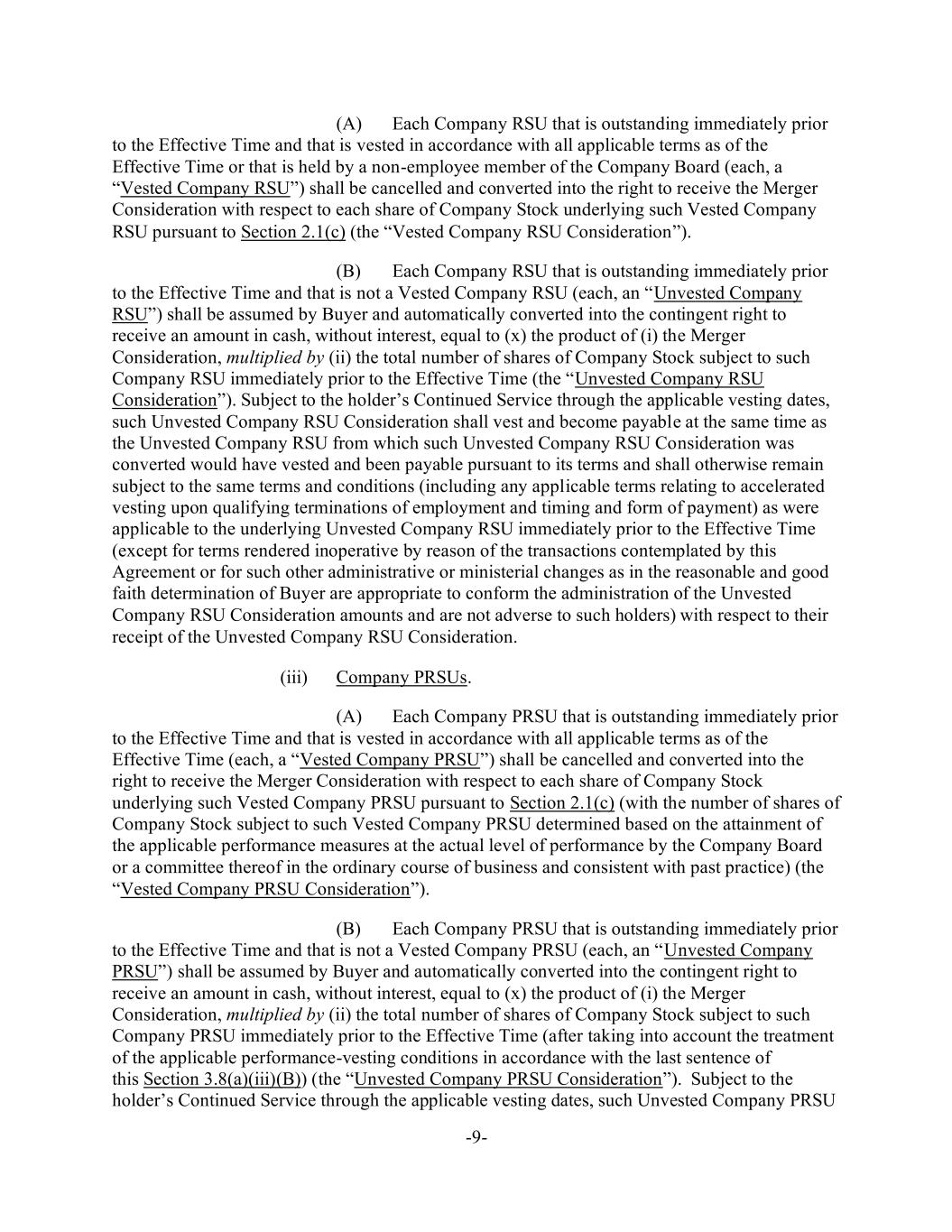 -9- (A) Each Company RSU that is outstanding immediately prior to the Effective Time and that is vested in accordance with all applicable terms as of the Effective Time or that is held by a non-employee member of the Company Board (each, a “Vested Company RSU”) shall be cancelled and converted into the right to receive the Merger Consideration with respect to each share of Company Stock underlying such Vested Company RSU pursuant to Section 2.1(c) (the “Vested Company RSU Consideration”). (B) Each Company RSU that is outstanding immediately prior to the Effective Time and that is not a Vested Company RSU (each, an “Unvested Company RSU”) shall be assumed by Buyer and automatically converted into the contingent right to receive an amount in cash, without interest, equal to (x) the product of (i) the Merger Consideration, multiplied by (ii) the total number of shares of Company Stock subject to such Company RSU immediately prior to the Effective Time (the “Unvested Company RSU Consideration”). Subject to the holder’s Continued Service through the applicable vesting dates, such Unvested Company RSU Consideration shall vest and become payable at the same time as the Unvested Company RSU from which such Unvested Company RSU Consideration was converted would have vested and been payable pursuant to its terms and shall otherwise remain subject to the same terms and conditions (including any applicable terms relating to accelerated vesting upon qualifying terminations of employment and timing and form of payment) as were applicable to the underlying Unvested Company RSU immediately prior to the Effective Time (except for terms rendered inoperative by reason of the transactions contemplated by this Agreement or for such other administrative or ministerial changes as in the reasonable and good faith determination of Buyer are appropriate to conform the administration of the Unvested Company RSU Consideration amounts and are not adverse to such holders) with respect to their receipt of the Unvested Company RSU Consideration. (iii) Company PRSUs. (A) Each Company PRSU that is outstanding immediately prior to the Effective Time and that is vested in accordance with all applicable terms as of the Effective Time (each, a “Vested Company PRSU”) shall be cancelled and converted into the right to receive the Merger Consideration with respect to each share of Company Stock underlying such Vested Company PRSU pursuant to Section 2.1(c) (with the number of shares of Company Stock subject to such Vested Company PRSU determined based on the attainment of the applicable performance measures at the actual level of performance by the Company Board or a committee thereof in the ordinary course of business and consistent with past practice) (the “Vested Company PRSU Consideration”). (B) Each Company PRSU that is outstanding immediately prior to the Effective Time and that is not a Vested Company PRSU (each, an “Unvested Company PRSU”) shall be assumed by Buyer and automatically converted into the contingent right to receive an amount in cash, without interest, equal to (x) the product of (i) the Merger Consideration, multiplied by (ii) the total number of shares of Company Stock subject to such Company PRSU immediately prior to the Effective Time (after taking into account the treatment of the applicable performance-vesting conditions in accordance with the last sentence of this Section 3.8(a)(iii)(B)) (the “Unvested Company PRSU Consideration”). Subject to the holder’s Continued Service through the applicable vesting dates, such Unvested Company PRSU