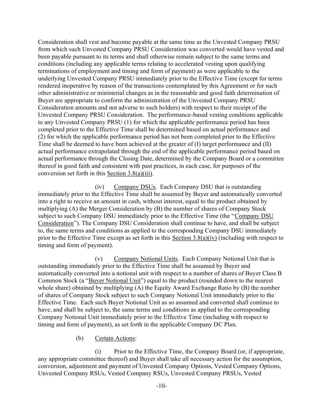 -10- Consideration shall vest and become payable at the same time as the Unvested Company PRSU from which such Unvested Company PRSU Consideration was converted would have vested and been payable pursuant to its terms and shall otherwise remain subject to the same terms and conditions (including any applicable terms relating to accelerated vesting upon qualifying terminations of employment and timing and form of payment) as were applicable to the underlying Unvested Company PRSU immediately prior to the Effective Time (except for terms rendered inoperative by reason of the transactions contemplated by this Agreement or for such other administrative or ministerial changes as in the reasonable and good faith determination of Buyer are appropriate to conform the administration of the Unvested Company PRSU Consideration amounts and not adverse to such holders) with respect to their receipt of the Unvested Company PRSU Consideration. The performance-based vesting conditions applicable to any Unvested Company PRSU (1) for which the applicable performance period has been completed prior to the Effective Time shall be determined based on actual performance and (2) for which the applicable performance period has not been completed prior to the Effective Time shall be deemed to have been achieved at the greater of (I) target performance and (II) actual performance extrapolated through the end of the applicable performance period based on actual performance through the Closing Date, determined by the Company Board or a committee thereof in good faith and consistent with past practices, in each case, for purposes of the conversion set forth in this Section 3.8(a)(iii). (iv) Company DSUs. Each Company DSU that is outstanding immediately prior to the Effective Time shall be assumed by Buyer and automatically converted into a right to receive an amount in cash, without interest, equal to the product obtained by multiplying (A) the Merger Consideration by (B) the number of shares of Company Stock subject to such Company DSU immediately prior to the Effective Time (the “Company DSU Consideration”). The Company DSU Consideration shall continue to have, and shall be subject to, the same terms and conditions as applied to the corresponding Company DSU immediately prior to the Effective Time except as set forth in this Section 3.8(a)(iv) (including with respect to timing and form of payment). (v) Company Notional Units. Each Company Notional Unit that is outstanding immediately prior to the Effective Time shall be assumed by Buyer and automatically converted into a notional unit with respect to a number of shares of Buyer Class B Common Stock (a “Buyer Notional Unit”) equal to the product (rounded down to the nearest whole share) obtained by multiplying (A) the Equity Award Exchange Ratio by (B) the number of shares of Company Stock subject to such Company Notional Unit immediately prior to the Effective Time. Each such Buyer Notional Unit as so assumed and converted shall continue to have, and shall be subject to, the same terms and conditions as applied to the corresponding Company Notional Unit immediately prior to the Effective Time (including with respect to timing and form of payment), as set forth in the applicable Company DC Plan. (b) Certain Actions: (i) Prior to the Effective Time, the Company Board (or, if appropriate, any appropriate committee thereof) and Buyer shall take all necessary action for the assumption, conversion, adjustment and payment of Unvested Company Options, Vested Company Options, Unvested Company RSUs, Vested Company RSUs, Unvested Company PRSUs, Vested