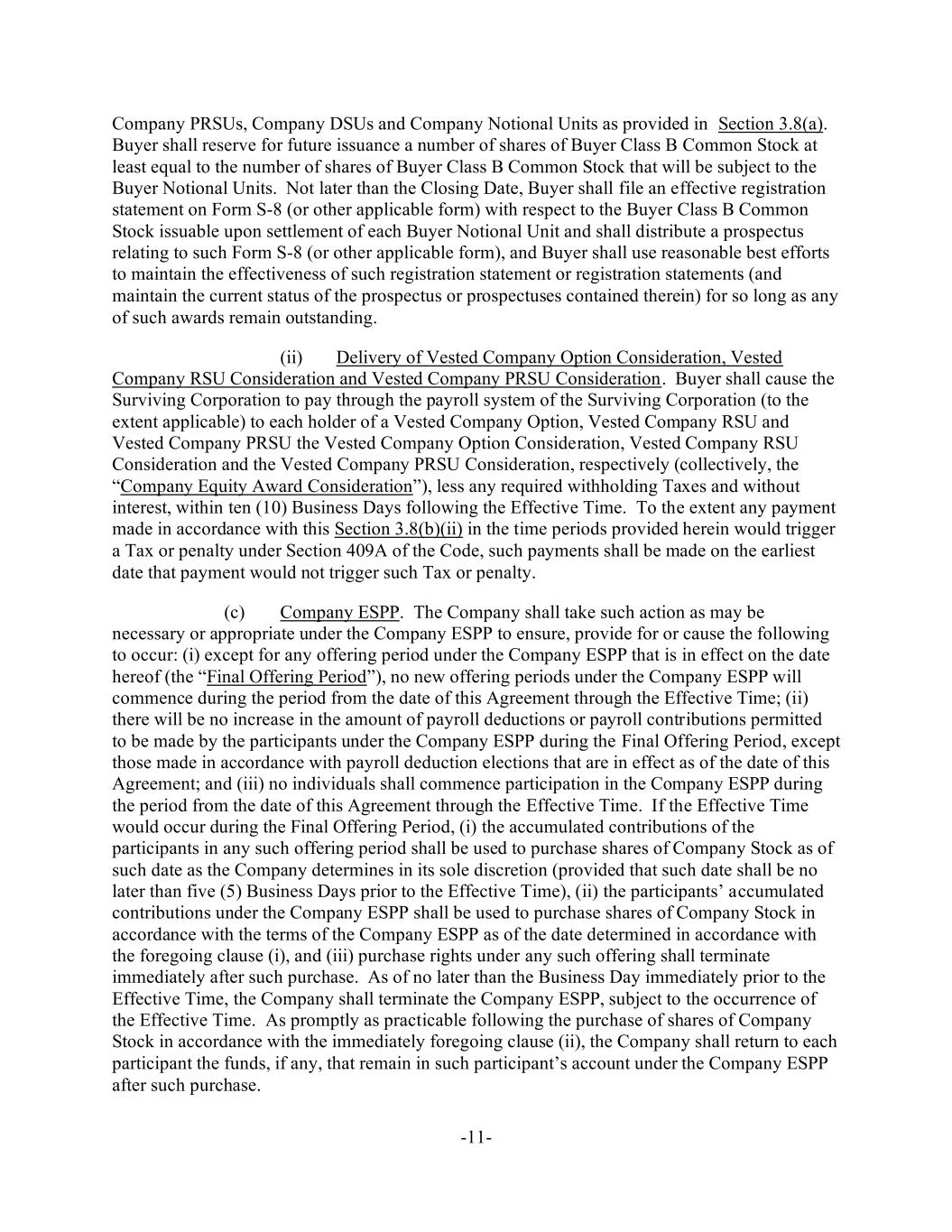 -11- Company PRSUs, Company DSUs and Company Notional Units as provided in Section 3.8(a). Buyer shall reserve for future issuance a number of shares of Buyer Class B Common Stock at least equal to the number of shares of Buyer Class B Common Stock that will be subject to the Buyer Notional Units. Not later than the Closing Date, Buyer shall file an effective registration statement on Form S-8 (or other applicable form) with respect to the Buyer Class B Common Stock issuable upon settlement of each Buyer Notional Unit and shall distribute a prospectus relating to such Form S-8 (or other applicable form), and Buyer shall use reasonable best efforts to maintain the effectiveness of such registration statement or registration statements (and maintain the current status of the prospectus or prospectuses contained therein) for so long as any of such awards remain outstanding. (ii) Delivery of Vested Company Option Consideration, Vested Company RSU Consideration and Vested Company PRSU Consideration. Buyer shall cause the Surviving Corporation to pay through the payroll system of the Surviving Corporation (to the extent applicable) to each holder of a Vested Company Option, Vested Company RSU and Vested Company PRSU the Vested Company Option Consideration, Vested Company RSU Consideration and the Vested Company PRSU Consideration, respectively (collectively, the “Company Equity Award Consideration”), less any required withholding Taxes and without interest, within ten (10) Business Days following the Effective Time. To the extent any payment made in accordance with this Section 3.8(b)(ii) in the time periods provided herein would trigger a Tax or penalty under Section 409A of the Code, such payments shall be made on the earliest date that payment would not trigger such Tax or penalty. (c) Company ESPP. The Company shall take such action as may be necessary or appropriate under the Company ESPP to ensure, provide for or cause the following to occur: (i) except for any offering period under the Company ESPP that is in effect on the date hereof (the “Final Offering Period”), no new offering periods under the Company ESPP will commence during the period from the date of this Agreement through the Effective Time; (ii) there will be no increase in the amount of payroll deductions or payroll contributions permitted to be made by the participants under the Company ESPP during the Final Offering Period, except those made in accordance with payroll deduction elections that are in effect as of the date of this Agreement; and (iii) no individuals shall commence participation in the Company ESPP during the period from the date of this Agreement through the Effective Time. If the Effective Time would occur during the Final Offering Period, (i) the accumulated contributions of the participants in any such offering period shall be used to purchase shares of Company Stock as of such date as the Company determines in its sole discretion (provided that such date shall be no later than five (5) Business Days prior to the Effective Time), (ii) the participants’ accumulated contributions under the Company ESPP shall be used to purchase shares of Company Stock in accordance with the terms of the Company ESPP as of the date determined in accordance with the foregoing clause (i), and (iii) purchase rights under any such offering shall terminate immediately after such purchase. As of no later than the Business Day immediately prior to the Effective Time, the Company shall terminate the Company ESPP, subject to the occurrence of the Effective Time. As promptly as practicable following the purchase of shares of Company Stock in accordance with the immediately foregoing clause (ii), the Company shall return to each participant the funds, if any, that remain in such participant’s account under the Company ESPP after such purchase.