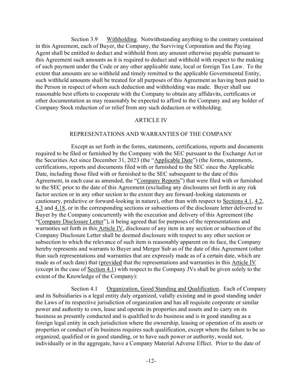 -12- Section 3.9 Withholding. Notwithstanding anything to the contrary contained in this Agreement, each of Buyer, the Company, the Surviving Corporation and the Paying Agent shall be entitled to deduct and withhold from any amount otherwise payable pursuant to this Agreement such amounts as it is required to deduct and withhold with respect to the making of such payment under the Code or any other applicable state, local or foreign Tax Law. To the extent that amounts are so withheld and timely remitted to the applicable Governmental Entity, such withheld amounts shall be treated for all purposes of this Agreement as having been paid to the Person in respect of whom such deduction and withholding was made. Buyer shall use reasonable best efforts to cooperate with the Company to obtain any affidavits, certificates or other documentation as may reasonably be expected to afford to the Company and any holder of Company Stock reduction of or relief from any such deduction or withholding. ARTICLE IV REPRESENTATIONS AND WARRANTIES OF THE COMPANY Except as set forth in the forms, statements, certifications, reports and documents required to be filed or furnished by the Company with the SEC pursuant to the Exchange Act or the Securities Act since December 31, 2023 (the “Applicable Date”) (the forms, statements, certifications, reports and documents filed with or furnished to the SEC since the Applicable Date, including those filed with or furnished to the SEC subsequent to the date of this Agreement, in each case as amended, the “Company Reports”) that were filed with or furnished to the SEC prior to the date of this Agreement (excluding any disclosures set forth in any risk factor section or in any other section to the extent they are forward-looking statements or cautionary, predictive or forward-looking in nature), other than with respect to Sections 4.1, 4.2, 4.3 and 4.18, or in the corresponding sections or subsections of the disclosure letter delivered to Buyer by the Company concurrently with the execution and delivery of this Agreement (the “Company Disclosure Letter”), it being agreed that for purposes of the representations and warranties set forth in this Article IV, disclosure of any item in any section or subsection of the Company Disclosure Letter shall be deemed disclosure with respect to any other section or subsection to which the relevance of such item is reasonably apparent on its face, the Company hereby represents and warrants to Buyer and Merger Sub as of the date of this Agreement (other than such representations and warranties that are expressly made as of a certain date, which are made as of such date) that (provided that the representations and warranties in this Article IV (except in the case of Section 4.1) with respect to the Company JVs shall be given solely to the extent of the Knowledge of the Company): Section 4.1 Organization, Good Standing and Qualification. Each of Company and its Subsidiaries is a legal entity duly organized, validly existing and in good standing under the Laws of its respective jurisdiction of organization and has all requisite corporate or similar power and authority to own, lease and operate its properties and assets and to carry on its business as presently conducted and is qualified to do business and is in good standing as a foreign legal entity in each jurisdiction where the ownership, leasing or operation of its assets or properties or conduct of its business requires such qualification, except where the failure to be so organized, qualified or in good standing, or to have such power or authority, would not, individually or in the aggregate, have a Company Material Adverse Effect. Prior to the date of
