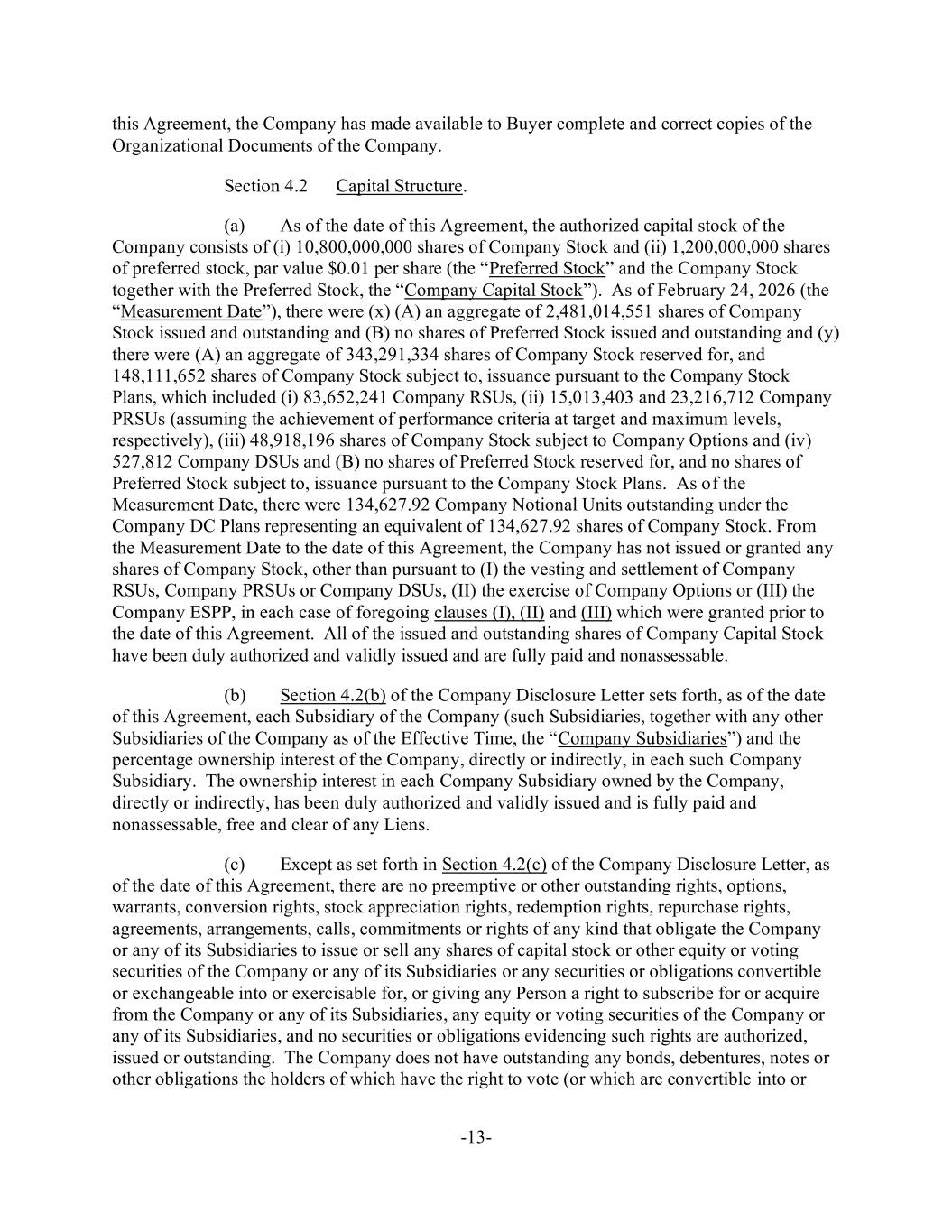 -13- this Agreement, the Company has made available to Buyer complete and correct copies of the Organizational Documents of the Company. Section 4.2 Capital Structure. (a) As of the date of this Agreement, the authorized capital stock of the Company consists of (i) 10,800,000,000 shares of Company Stock and (ii) 1,200,000,000 shares of preferred stock, par value $0.01 per share (the “Preferred Stock” and the Company Stock together with the Preferred Stock, the “Company Capital Stock”). As of February 24, 2026 (the “Measurement Date”), there were (x) (A) an aggregate of 2,481,014,551 shares of Company Stock issued and outstanding and (B) no shares of Preferred Stock issued and outstanding and (y) there were (A) an aggregate of 343,291,334 shares of Company Stock reserved for, and 148,111,652 shares of Company Stock subject to, issuance pursuant to the Company Stock Plans, which included (i) 83,652,241 Company RSUs, (ii) 15,013,403 and 23,216,712 Company PRSUs (assuming the achievement of performance criteria at target and maximum levels, respectively), (iii) 48,918,196 shares of Company Stock subject to Company Options and (iv) 527,812 Company DSUs and (B) no shares of Preferred Stock reserved for, and no shares of Preferred Stock subject to, issuance pursuant to the Company Stock Plans. As of the Measurement Date, there were 134,627.92 Company Notional Units outstanding under the Company DC Plans representing an equivalent of 134,627.92 shares of Company Stock. From the Measurement Date to the date of this Agreement, the Company has not issued or granted any shares of Company Stock, other than pursuant to (I) the vesting and settlement of Company RSUs, Company PRSUs or Company DSUs, (II) the exercise of Company Options or (III) the Company ESPP, in each case of foregoing clauses (I), (II) and (III) which were granted prior to the date of this Agreement. All of the issued and outstanding shares of Company Capital Stock have been duly authorized and validly issued and are fully paid and nonassessable. (b) Section 4.2(b) of the Company Disclosure Letter sets forth, as of the date of this Agreement, each Subsidiary of the Company (such Subsidiaries, together with any other Subsidiaries of the Company as of the Effective Time, the “Company Subsidiaries”) and the percentage ownership interest of the Company, directly or indirectly, in each such Company Subsidiary. The ownership interest in each Company Subsidiary owned by the Company, directly or indirectly, has been duly authorized and validly issued and is fully paid and nonassessable, free and clear of any Liens. (c) Except as set forth in Section 4.2(c) of the Company Disclosure Letter, as of the date of this Agreement, there are no preemptive or other outstanding rights, options, warrants, conversion rights, stock appreciation rights, redemption rights, repurchase rights, agreements, arrangements, calls, commitments or rights of any kind that obligate the Company or any of its Subsidiaries to issue or sell any shares of capital stock or other equity or voting securities of the Company or any of its Subsidiaries or any securities or obligations convertible or exchangeable into or exercisable for, or giving any Person a right to subscribe for or acquire from the Company or any of its Subsidiaries, any equity or voting securities of the Company or any of its Subsidiaries, and no securities or obligations evidencing such rights are authorized, issued or outstanding. The Company does not have outstanding any bonds, debentures, notes or other obligations the holders of which have the right to vote (or which are convertible into or