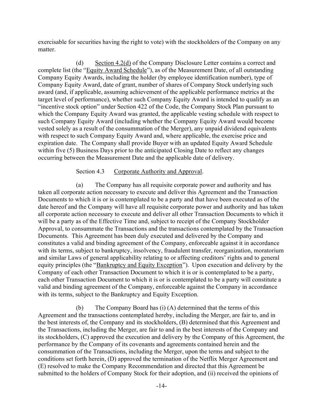 -14- exercisable for securities having the right to vote) with the stockholders of the Company on any matter. (d) Section 4.2(d) of the Company Disclosure Letter contains a correct and complete list (the “Equity Award Schedule”), as of the Measurement Date, of all outstanding Company Equity Awards, including the holder (by employee identification number), type of Company Equity Award, date of grant, number of shares of Company Stock underlying such award (and, if applicable, assuming achievement of the applicable performance metrics at the target level of performance), whether such Company Equity Award is intended to qualify as an “incentive stock option” under Section 422 of the Code, the Company Stock Plan pursuant to which the Company Equity Award was granted, the applicable vesting schedule with respect to such Company Equity Award (including whether the Company Equity Award would become vested solely as a result of the consummation of the Merger), any unpaid dividend equivalents with respect to such Company Equity Award and, where applicable, the exercise price and expiration date. The Company shall provide Buyer with an updated Equity Award Schedule within five (5) Business Days prior to the anticipated Closing Date to reflect any changes occurring between the Measurement Date and the applicable date of delivery. Section 4.3 Corporate Authority and Approval. (a) The Company has all requisite corporate power and authority and has taken all corporate action necessary to execute and deliver this Agreement and the Transaction Documents to which it is or is contemplated to be a party and that have been executed as of the date hereof and the Company will have all requisite corporate power and authority and has taken all corporate action necessary to execute and deliver all other Transaction Documents to which it will be a party as of the Effective Time and, subject to receipt of the Company Stockholder Approval, to consummate the Transactions and the transactions contemplated by the Transaction Documents. This Agreement has been duly executed and delivered by the Company and constitutes a valid and binding agreement of the Company, enforceable against it in accordance with its terms, subject to bankruptcy, insolvency, fraudulent transfer, reorganization, moratorium and similar Laws of general applicability relating to or affecting creditors’ rights and to general equity principles (the “Bankruptcy and Equity Exception”). Upon execution and delivery by the Company of each other Transaction Document to which it is or is contemplated to be a party, each other Transaction Document to which it is or is contemplated to be a party will constitute a valid and binding agreement of the Company, enforceable against the Company in accordance with its terms, subject to the Bankruptcy and Equity Exception. (b) The Company Board has (i) (A) determined that the terms of this Agreement and the transactions contemplated hereby, including the Merger, are fair to, and in the best interests of, the Company and its stockholders, (B) determined that this Agreement and the Transactions, including the Merger, are fair to and in the best interests of the Company and its stockholders, (C) approved the execution and delivery by the Company of this Agreement, the performance by the Company of its covenants and agreements contained herein and the consummation of the Transactions, including the Merger, upon the terms and subject to the conditions set forth herein, (D) approved the termination of the Netflix Merger Agreement and (E) resolved to make the Company Recommendation and directed that this Agreement be submitted to the holders of Company Stock for their adoption, and (ii) received the opinions of