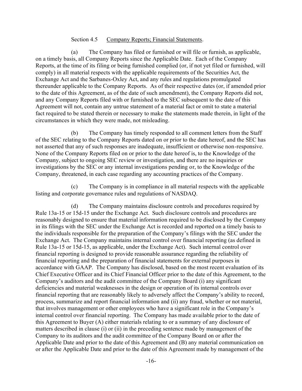 -16- Section 4.5 Company Reports; Financial Statements. (a) The Company has filed or furnished or will file or furnish, as applicable, on a timely basis, all Company Reports since the Applicable Date. Each of the Company Reports, at the time of its filing or being furnished complied (or, if not yet filed or furnished, will comply) in all material respects with the applicable requirements of the Securities Act, the Exchange Act and the Sarbanes-Oxley Act, and any rules and regulations promulgated thereunder applicable to the Company Reports. As of their respective dates (or, if amended prior to the date of this Agreement, as of the date of such amendment), the Company Reports did not, and any Company Reports filed with or furnished to the SEC subsequent to the date of this Agreement will not, contain any untrue statement of a material fact or omit to state a material fact required to be stated therein or necessary to make the statements made therein, in light of the circumstances in which they were made, not misleading. (b) The Company has timely responded to all comment letters from the Staff of the SEC relating to the Company Reports dated on or prior to the date hereof, and the SEC has not asserted that any of such responses are inadequate, insufficient or otherwise non-responsive. None of the Company Reports filed on or prior to the date hereof is, to the Knowledge of the Company, subject to ongoing SEC review or investigation, and there are no inquiries or investigations by the SEC or any internal investigations pending or, to the Knowledge of the Company, threatened, in each case regarding any accounting practices of the Company. (c) The Company is in compliance in all material respects with the applicable listing and corporate governance rules and regulations of NASDAQ. (d) The Company maintains disclosure controls and procedures required by Rule 13a-15 or 15d-15 under the Exchange Act. Such disclosure controls and procedures are reasonably designed to ensure that material information required to be disclosed by the Company in its filings with the SEC under the Exchange Act is recorded and reported on a timely basis to the individuals responsible for the preparation of the Company’s filings with the SEC under the Exchange Act. The Company maintains internal control over financial reporting (as defined in Rule 13a-15 or 15d-15, as applicable, under the Exchange Act). Such internal control over financial reporting is designed to provide reasonable assurance regarding the reliability of financial reporting and the preparation of financial statements for external purposes in accordance with GAAP. The Company has disclosed, based on the most recent evaluation of its Chief Executive Officer and its Chief Financial Officer prior to the date of this Agreement, to the Company’s auditors and the audit committee of the Company Board (i) any significant deficiencies and material weaknesses in the design or operation of its internal controls over financial reporting that are reasonably likely to adversely affect the Company’s ability to record, process, summarize and report financial information and (ii) any fraud, whether or not material, that involves management or other employees who have a significant role in the Company’s internal control over financial reporting. The Company has made available prior to the date of this Agreement to Buyer (A) either materials relating to or a summary of any disclosure of matters described in clause (i) or (ii) in the preceding sentence made by management of the Company to its auditors and the audit committee of the Company Board on or after the Applicable Date and prior to the date of this Agreement and (B) any material communication on or after the Applicable Date and prior to the date of this Agreement made by management of the