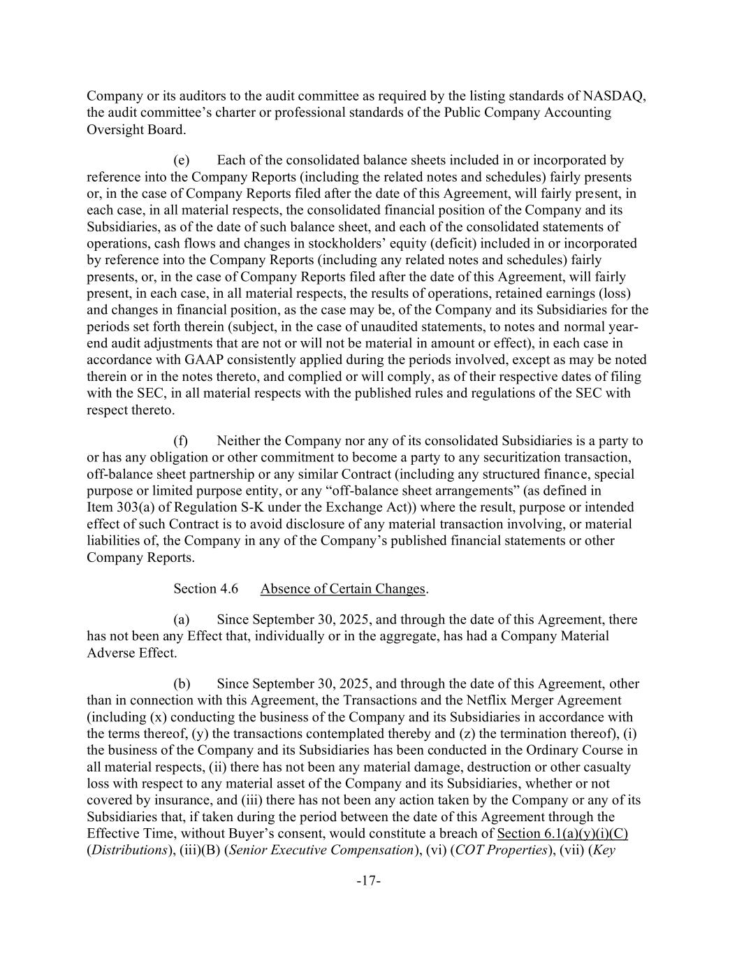 -17- Company or its auditors to the audit committee as required by the listing standards of NASDAQ, the audit committee’s charter or professional standards of the Public Company Accounting Oversight Board. (e) Each of the consolidated balance sheets included in or incorporated by reference into the Company Reports (including the related notes and schedules) fairly presents or, in the case of Company Reports filed after the date of this Agreement, will fairly present, in each case, in all material respects, the consolidated financial position of the Company and its Subsidiaries, as of the date of such balance sheet, and each of the consolidated statements of operations, cash flows and changes in stockholders’ equity (deficit) included in or incorporated by reference into the Company Reports (including any related notes and schedules) fairly presents, or, in the case of Company Reports filed after the date of this Agreement, will fairly present, in each case, in all material respects, the results of operations, retained earnings (loss) and changes in financial position, as the case may be, of the Company and its Subsidiaries for the periods set forth therein (subject, in the case of unaudited statements, to notes and normal year- end audit adjustments that are not or will not be material in amount or effect), in each case in accordance with GAAP consistently applied during the periods involved, except as may be noted therein or in the notes thereto, and complied or will comply, as of their respective dates of filing with the SEC, in all material respects with the published rules and regulations of the SEC with respect thereto. (f) Neither the Company nor any of its consolidated Subsidiaries is a party to or has any obligation or other commitment to become a party to any securitization transaction, off-balance sheet partnership or any similar Contract (including any structured finance, special purpose or limited purpose entity, or any “off-balance sheet arrangements” (as defined in Item 303(a) of Regulation S-K under the Exchange Act)) where the result, purpose or intended effect of such Contract is to avoid disclosure of any material transaction involving, or material liabilities of, the Company in any of the Company’s published financial statements or other Company Reports. Section 4.6 Absence of Certain Changes. (a) Since September 30, 2025, and through the date of this Agreement, there has not been any Effect that, individually or in the aggregate, has had a Company Material Adverse Effect. (b) Since September 30, 2025, and through the date of this Agreement, other than in connection with this Agreement, the Transactions and the Netflix Merger Agreement (including (x) conducting the business of the Company and its Subsidiaries in accordance with the terms thereof, (y) the transactions contemplated thereby and (z) the termination thereof), (i) the business of the Company and its Subsidiaries has been conducted in the Ordinary Course in all material respects, (ii) there has not been any material damage, destruction or other casualty loss with respect to any material asset of the Company and its Subsidiaries, whether or not covered by insurance, and (iii) there has not been any action taken by the Company or any of its Subsidiaries that, if taken during the period between the date of this Agreement through the Effective Time, without Buyer’s consent, would constitute a breach of Section 6.1(a)(y)(i)(C) (Distributions), (iii)(B) (Senior Executive Compensation), (vi) (COT Properties), (vii) (Key
