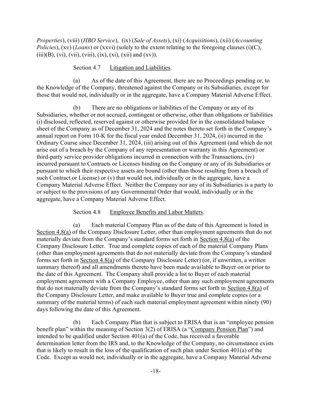 -18- Properties), (viii) (HBO Service), (ix) (Sale of Assets), (xi) (Acquisitions), (xii) (Accounting Policies), (xv) (Loans) or (xxvi) (solely to the extent relating to the foregoing clauses (i)(C), (iii)(B), (vi), (vii), (viii), (ix), (xi), (xii) and (xv)). Section 4.7 Litigation and Liabilities. (a) As of the date of this Agreement, there are no Proceedings pending or, to the Knowledge of the Company, threatened against the Company or its Subsidiaries, except for those that would not, individually or in the aggregate, have a Company Material Adverse Effect. (b) There are no obligations or liabilities of the Company or any of its Subsidiaries, whether or not accrued, contingent or otherwise, other than obligations or liabilities (i) disclosed, reflected, reserved against or otherwise provided for in the consolidated balance sheet of the Company as of December 31, 2024 and the notes thereto set forth in the Company’s annual report on Form 10-K for the fiscal year ended December 31, 2024, (ii) incurred in the Ordinary Course since December 31, 2024, (iii) arising out of this Agreement (and which do not arise out of a breach by the Company of any representation or warranty in this Agreement) or third-party service provider obligations incurred in connection with the Transactions, (iv) incurred pursuant to Contracts or Licenses binding on the Company or any of its Subsidiaries or pursuant to which their respective assets are bound (other than those resulting from a breach of such Contract or License) or (v) that would not, individually or in the aggregate, have a Company Material Adverse Effect. Neither the Company nor any of its Subsidiaries is a party to or subject to the provisions of any Governmental Order that would, individually or in the aggregate, have a Company Material Adverse Effect. Section 4.8 Employee Benefits and Labor Matters. (a) Each material Company Plan as of the date of this Agreement is listed in Section 4.8(a) of the Company Disclosure Letter, other than employment agreements that do not materially deviate from the Company’s standard forms set forth in Section 4.8(a) of the Company Disclosure Letter. True and complete copies of each of the material Company Plans (other than employment agreements that do not materially deviate from the Company’s standard forms set forth in Section 4.8(a) of the Company Disclosure Letter) (or, if unwritten, a written summary thereof) and all amendments thereto have been made available to Buyer on or prior to the date of this Agreement. The Company shall provide a list to Buyer of each material employment agreement with a Company Employee, other than any such employment agreements that do not materially deviate from the Company’s standard forms set forth in Section 4.8(a) of the Company Disclosure Letter, and make available to Buyer true and complete copies (or a summary of the material terms) of each such material employment agreement within ninety (90) days following the date of this Agreement. (b) Each Company Plan that is subject to ERISA that is an “employee pension benefit plan” within the meaning of Section 3(2) of ERISA (a “Company Pension Plan”) and intended to be qualified under Section 401(a) of the Code, has received a favorable determination letter from the IRS and, to the Knowledge of the Company, no circumstance exists that is likely to result in the loss of the qualification of such plan under Section 401(a) of the Code. Except as would not, individually or in the aggregate, have a Company Material Adverse