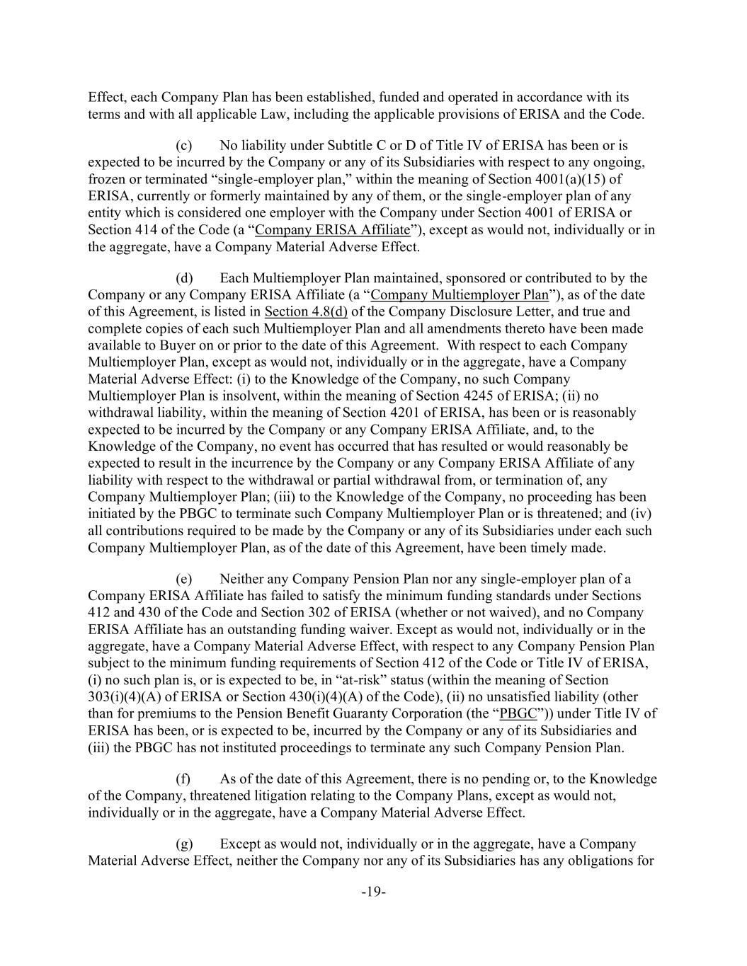 -19- Effect, each Company Plan has been established, funded and operated in accordance with its terms and with all applicable Law, including the applicable provisions of ERISA and the Code. (c) No liability under Subtitle C or D of Title IV of ERISA has been or is expected to be incurred by the Company or any of its Subsidiaries with respect to any ongoing, frozen or terminated “single-employer plan,” within the meaning of Section 4001(a)(15) of ERISA, currently or formerly maintained by any of them, or the single-employer plan of any entity which is considered one employer with the Company under Section 4001 of ERISA or Section 414 of the Code (a “Company ERISA Affiliate”), except as would not, individually or in the aggregate, have a Company Material Adverse Effect. (d) Each Multiemployer Plan maintained, sponsored or contributed to by the Company or any Company ERISA Affiliate (a “Company Multiemployer Plan”), as of the date of this Agreement, is listed in Section 4.8(d) of the Company Disclosure Letter, and true and complete copies of each such Multiemployer Plan and all amendments thereto have been made available to Buyer on or prior to the date of this Agreement. With respect to each Company Multiemployer Plan, except as would not, individually or in the aggregate, have a Company Material Adverse Effect: (i) to the Knowledge of the Company, no such Company Multiemployer Plan is insolvent, within the meaning of Section 4245 of ERISA; (ii) no withdrawal liability, within the meaning of Section 4201 of ERISA, has been or is reasonably expected to be incurred by the Company or any Company ERISA Affiliate, and, to the Knowledge of the Company, no event has occurred that has resulted or would reasonably be expected to result in the incurrence by the Company or any Company ERISA Affiliate of any liability with respect to the withdrawal or partial withdrawal from, or termination of, any Company Multiemployer Plan; (iii) to the Knowledge of the Company, no proceeding has been initiated by the PBGC to terminate such Company Multiemployer Plan or is threatened; and (iv) all contributions required to be made by the Company or any of its Subsidiaries under each such Company Multiemployer Plan, as of the date of this Agreement, have been timely made. (e) Neither any Company Pension Plan nor any single-employer plan of a Company ERISA Affiliate has failed to satisfy the minimum funding standards under Sections 412 and 430 of the Code and Section 302 of ERISA (whether or not waived), and no Company ERISA Affiliate has an outstanding funding waiver. Except as would not, individually or in the aggregate, have a Company Material Adverse Effect, with respect to any Company Pension Plan subject to the minimum funding requirements of Section 412 of the Code or Title IV of ERISA, (i) no such plan is, or is expected to be, in “at-risk” status (within the meaning of Section 303(i)(4)(A) of ERISA or Section 430(i)(4)(A) of the Code), (ii) no unsatisfied liability (other than for premiums to the Pension Benefit Guaranty Corporation (the “PBGC”)) under Title IV of ERISA has been, or is expected to be, incurred by the Company or any of its Subsidiaries and (iii) the PBGC has not instituted proceedings to terminate any such Company Pension Plan. (f) As of the date of this Agreement, there is no pending or, to the Knowledge of the Company, threatened litigation relating to the Company Plans, except as would not, individually or in the aggregate, have a Company Material Adverse Effect. (g) Except as would not, individually or in the aggregate, have a Company Material Adverse Effect, neither the Company nor any of its Subsidiaries has any obligations for