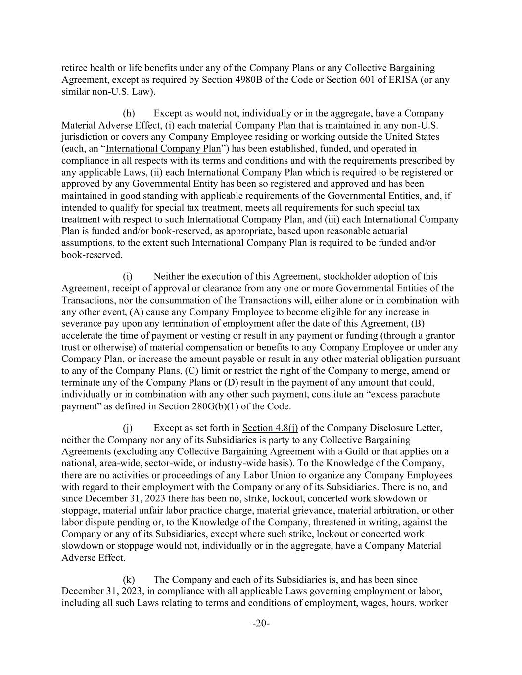 -20- retiree health or life benefits under any of the Company Plans or any Collective Bargaining Agreement, except as required by Section 4980B of the Code or Section 601 of ERISA (or any similar non-U.S. Law). (h) Except as would not, individually or in the aggregate, have a Company Material Adverse Effect, (i) each material Company Plan that is maintained in any non-U.S. jurisdiction or covers any Company Employee residing or working outside the United States (each, an “International Company Plan”) has been established, funded, and operated in compliance in all respects with its terms and conditions and with the requirements prescribed by any applicable Laws, (ii) each International Company Plan which is required to be registered or approved by any Governmental Entity has been so registered and approved and has been maintained in good standing with applicable requirements of the Governmental Entities, and, if intended to qualify for special tax treatment, meets all requirements for such special tax treatment with respect to such International Company Plan, and (iii) each International Company Plan is funded and/or book-reserved, as appropriate, based upon reasonable actuarial assumptions, to the extent such International Company Plan is required to be funded and/or book-reserved. (i) Neither the execution of this Agreement, stockholder adoption of this Agreement, receipt of approval or clearance from any one or more Governmental Entities of the Transactions, nor the consummation of the Transactions will, either alone or in combination with any other event, (A) cause any Company Employee to become eligible for any increase in severance pay upon any termination of employment after the date of this Agreement, (B) accelerate the time of payment or vesting or result in any payment or funding (through a grantor trust or otherwise) of material compensation or benefits to any Company Employee or under any Company Plan, or increase the amount payable or result in any other material obligation pursuant to any of the Company Plans, (C) limit or restrict the right of the Company to merge, amend or terminate any of the Company Plans or (D) result in the payment of any amount that could, individually or in combination with any other such payment, constitute an “excess parachute payment” as defined in Section 280G(b)(1) of the Code. (j) Except as set forth in Section 4.8(j) of the Company Disclosure Letter, neither the Company nor any of its Subsidiaries is party to any Collective Bargaining Agreements (excluding any Collective Bargaining Agreement with a Guild or that applies on a national, area-wide, sector-wide, or industry-wide basis). To the Knowledge of the Company, there are no activities or proceedings of any Labor Union to organize any Company Employees with regard to their employment with the Company or any of its Subsidiaries. There is no, and since December 31, 2023 there has been no, strike, lockout, concerted work slowdown or stoppage, material unfair labor practice charge, material grievance, material arbitration, or other labor dispute pending or, to the Knowledge of the Company, threatened in writing, against the Company or any of its Subsidiaries, except where such strike, lockout or concerted work slowdown or stoppage would not, individually or in the aggregate, have a Company Material Adverse Effect. (k) The Company and each of its Subsidiaries is, and has been since December 31, 2023, in compliance with all applicable Laws governing employment or labor, including all such Laws relating to terms and conditions of employment, wages, hours, worker