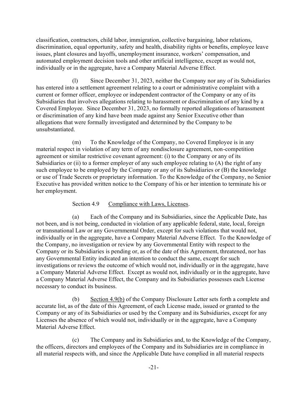 -21- classification, contractors, child labor, immigration, collective bargaining, labor relations, discrimination, equal opportunity, safety and health, disability rights or benefits, employee leave issues, plant closures and layoffs, unemployment insurance, workers’ compensation, and automated employment decision tools and other artificial intelligence, except as would not, individually or in the aggregate, have a Company Material Adverse Effect. (l) Since December 31, 2023, neither the Company nor any of its Subsidiaries has entered into a settlement agreement relating to a court or administrative complaint with a current or former officer, employee or independent contractor of the Company or any of its Subsidiaries that involves allegations relating to harassment or discrimination of any kind by a Covered Employee. Since December 31, 2023, no formally reported allegations of harassment or discrimination of any kind have been made against any Senior Executive other than allegations that were formally investigated and determined by the Company to be unsubstantiated. (m) To the Knowledge of the Company, no Covered Employee is in any material respect in violation of any term of any nondisclosure agreement, non-competition agreement or similar restrictive covenant agreement: (i) to the Company or any of its Subsidiaries or (ii) to a former employer of any such employee relating to (A) the right of any such employee to be employed by the Company or any of its Subsidiaries or (B) the knowledge or use of Trade Secrets or proprietary information. To the Knowledge of the Company, no Senior Executive has provided written notice to the Company of his or her intention to terminate his or her employment. Section 4.9 Compliance with Laws, Licenses. (a) Each of the Company and its Subsidiaries, since the Applicable Date, has not been, and is not being, conducted in violation of any applicable federal, state, local, foreign or transnational Law or any Governmental Order, except for such violations that would not, individually or in the aggregate, have a Company Material Adverse Effect. To the Knowledge of the Company, no investigation or review by any Governmental Entity with respect to the Company or its Subsidiaries is pending or, as of the date of this Agreement, threatened, nor has any Governmental Entity indicated an intention to conduct the same, except for such investigations or reviews the outcome of which would not, individually or in the aggregate, have a Company Material Adverse Effect. Except as would not, individually or in the aggregate, have a Company Material Adverse Effect, the Company and its Subsidiaries possesses each License necessary to conduct its business. (b) Section 4.9(b) of the Company Disclosure Letter sets forth a complete and accurate list, as of the date of this Agreement, of each License made, issued or granted to the Company or any of its Subsidiaries or used by the Company and its Subsidiaries, except for any Licenses the absence of which would not, individually or in the aggregate, have a Company Material Adverse Effect. (c) The Company and its Subsidiaries and, to the Knowledge of the Company, the officers, directors and employees of the Company and its Subsidiaries are in compliance in all material respects with, and since the Applicable Date have complied in all material respects
