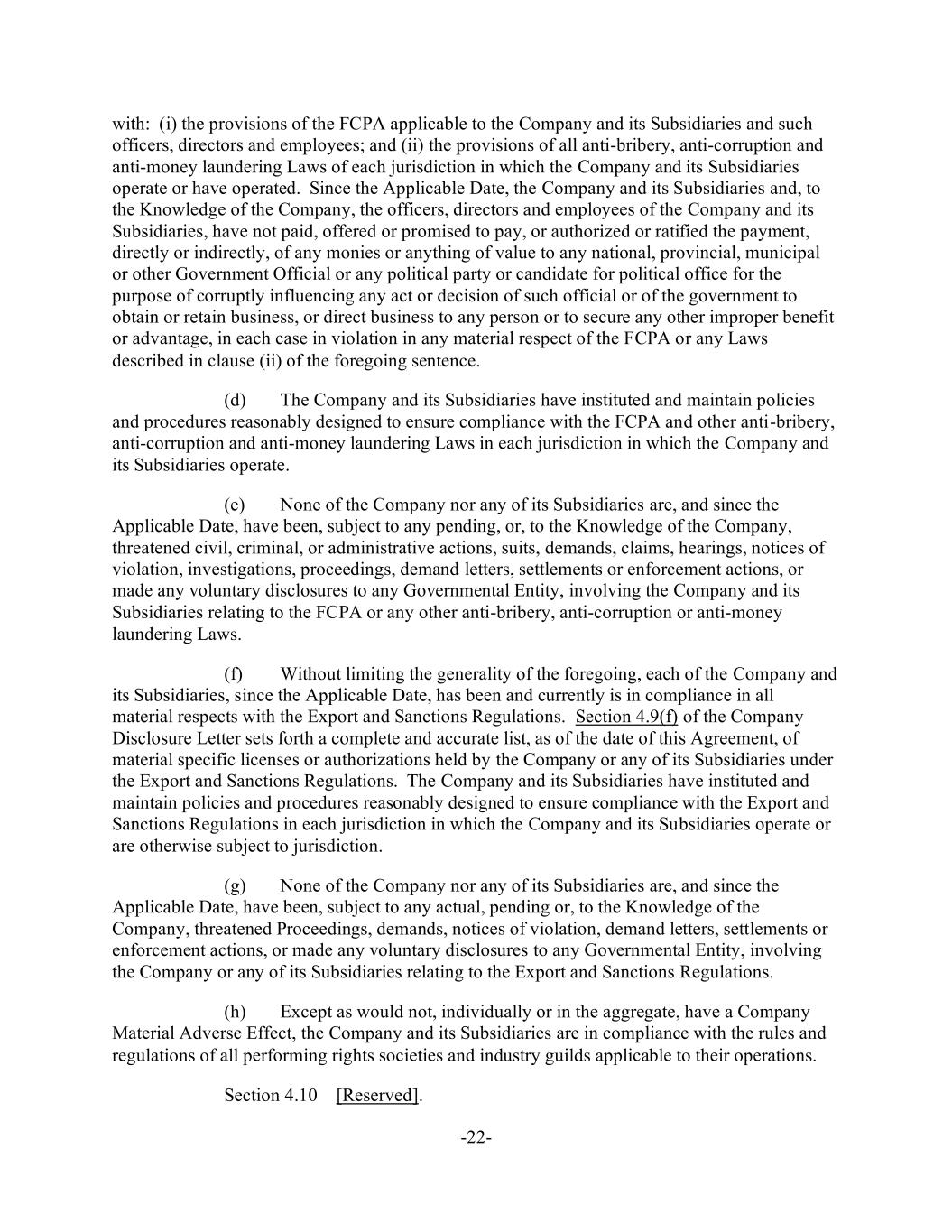 -22- with: (i) the provisions of the FCPA applicable to the Company and its Subsidiaries and such officers, directors and employees; and (ii) the provisions of all anti-bribery, anti-corruption and anti-money laundering Laws of each jurisdiction in which the Company and its Subsidiaries operate or have operated. Since the Applicable Date, the Company and its Subsidiaries and, to the Knowledge of the Company, the officers, directors and employees of the Company and its Subsidiaries, have not paid, offered or promised to pay, or authorized or ratified the payment, directly or indirectly, of any monies or anything of value to any national, provincial, municipal or other Government Official or any political party or candidate for political office for the purpose of corruptly influencing any act or decision of such official or of the government to obtain or retain business, or direct business to any person or to secure any other improper benefit or advantage, in each case in violation in any material respect of the FCPA or any Laws described in clause (ii) of the foregoing sentence. (d) The Company and its Subsidiaries have instituted and maintain policies and procedures reasonably designed to ensure compliance with the FCPA and other anti-bribery, anti-corruption and anti-money laundering Laws in each jurisdiction in which the Company and its Subsidiaries operate. (e) None of the Company nor any of its Subsidiaries are, and since the Applicable Date, have been, subject to any pending, or, to the Knowledge of the Company, threatened civil, criminal, or administrative actions, suits, demands, claims, hearings, notices of violation, investigations, proceedings, demand letters, settlements or enforcement actions, or made any voluntary disclosures to any Governmental Entity, involving the Company and its Subsidiaries relating to the FCPA or any other anti-bribery, anti-corruption or anti-money laundering Laws. (f) Without limiting the generality of the foregoing, each of the Company and its Subsidiaries, since the Applicable Date, has been and currently is in compliance in all material respects with the Export and Sanctions Regulations. Section 4.9(f) of the Company Disclosure Letter sets forth a complete and accurate list, as of the date of this Agreement, of material specific licenses or authorizations held by the Company or any of its Subsidiaries under the Export and Sanctions Regulations. The Company and its Subsidiaries have instituted and maintain policies and procedures reasonably designed to ensure compliance with the Export and Sanctions Regulations in each jurisdiction in which the Company and its Subsidiaries operate or are otherwise subject to jurisdiction. (g) None of the Company nor any of its Subsidiaries are, and since the Applicable Date, have been, subject to any actual, pending or, to the Knowledge of the Company, threatened Proceedings, demands, notices of violation, demand letters, settlements or enforcement actions, or made any voluntary disclosures to any Governmental Entity, involving the Company or any of its Subsidiaries relating to the Export and Sanctions Regulations. (h) Except as would not, individually or in the aggregate, have a Company Material Adverse Effect, the Company and its Subsidiaries are in compliance with the rules and regulations of all performing rights societies and industry guilds applicable to their operations. Section 4.10 [Reserved].