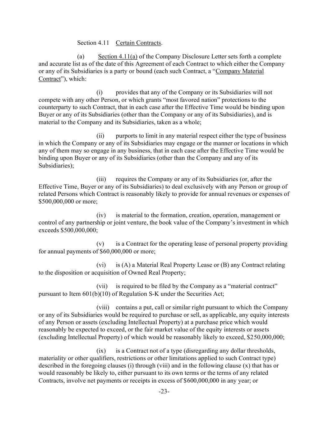 -23- Section 4.11 Certain Contracts. (a) Section 4.11(a) of the Company Disclosure Letter sets forth a complete and accurate list as of the date of this Agreement of each Contract to which either the Company or any of its Subsidiaries is a party or bound (each such Contract, a “Company Material Contract”), which: (i) provides that any of the Company or its Subsidiaries will not compete with any other Person, or which grants “most favored nation” protections to the counterparty to such Contract, that in each case after the Effective Time would be binding upon Buyer or any of its Subsidiaries (other than the Company or any of its Subsidiaries), and is material to the Company and its Subsidiaries, taken as a whole; (ii) purports to limit in any material respect either the type of business in which the Company or any of its Subsidiaries may engage or the manner or locations in which any of them may so engage in any business, that in each case after the Effective Time would be binding upon Buyer or any of its Subsidiaries (other than the Company and any of its Subsidiaries); (iii) requires the Company or any of its Subsidiaries (or, after the Effective Time, Buyer or any of its Subsidiaries) to deal exclusively with any Person or group of related Persons which Contract is reasonably likely to provide for annual revenues or expenses of $500,000,000 or more; (iv) is material to the formation, creation, operation, management or control of any partnership or joint venture, the book value of the Company’s investment in which exceeds $500,000,000; (v) is a Contract for the operating lease of personal property providing for annual payments of $60,000,000 or more; (vi) is (A) a Material Real Property Lease or (B) any Contract relating to the disposition or acquisition of Owned Real Property; (vii) is required to be filed by the Company as a “material contract” pursuant to Item 601(b)(10) of Regulation S-K under the Securities Act; (viii) contains a put, call or similar right pursuant to which the Company or any of its Subsidiaries would be required to purchase or sell, as applicable, any equity interests of any Person or assets (excluding Intellectual Property) at a purchase price which would reasonably be expected to exceed, or the fair market value of the equity interests or assets (excluding Intellectual Property) of which would be reasonably likely to exceed, $250,000,000; (ix) is a Contract not of a type (disregarding any dollar thresholds, materiality or other qualifiers, restrictions or other limitations applied to such Contract type) described in the foregoing clauses (i) through (viii) and in the following clause (x) that has or would reasonably be likely to, either pursuant to its own terms or the terms of any related Contracts, involve net payments or receipts in excess of $600,000,000 in any year; or